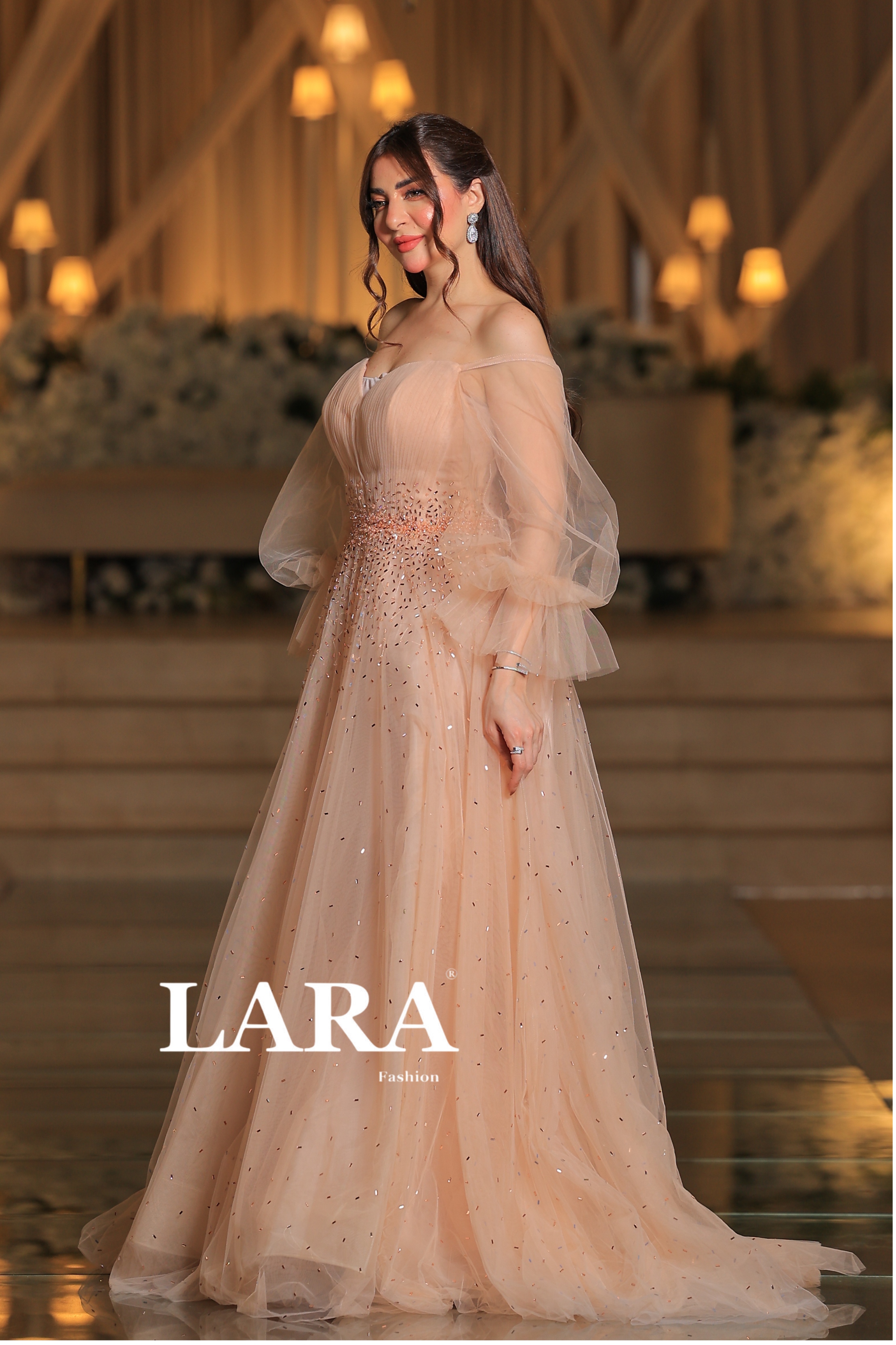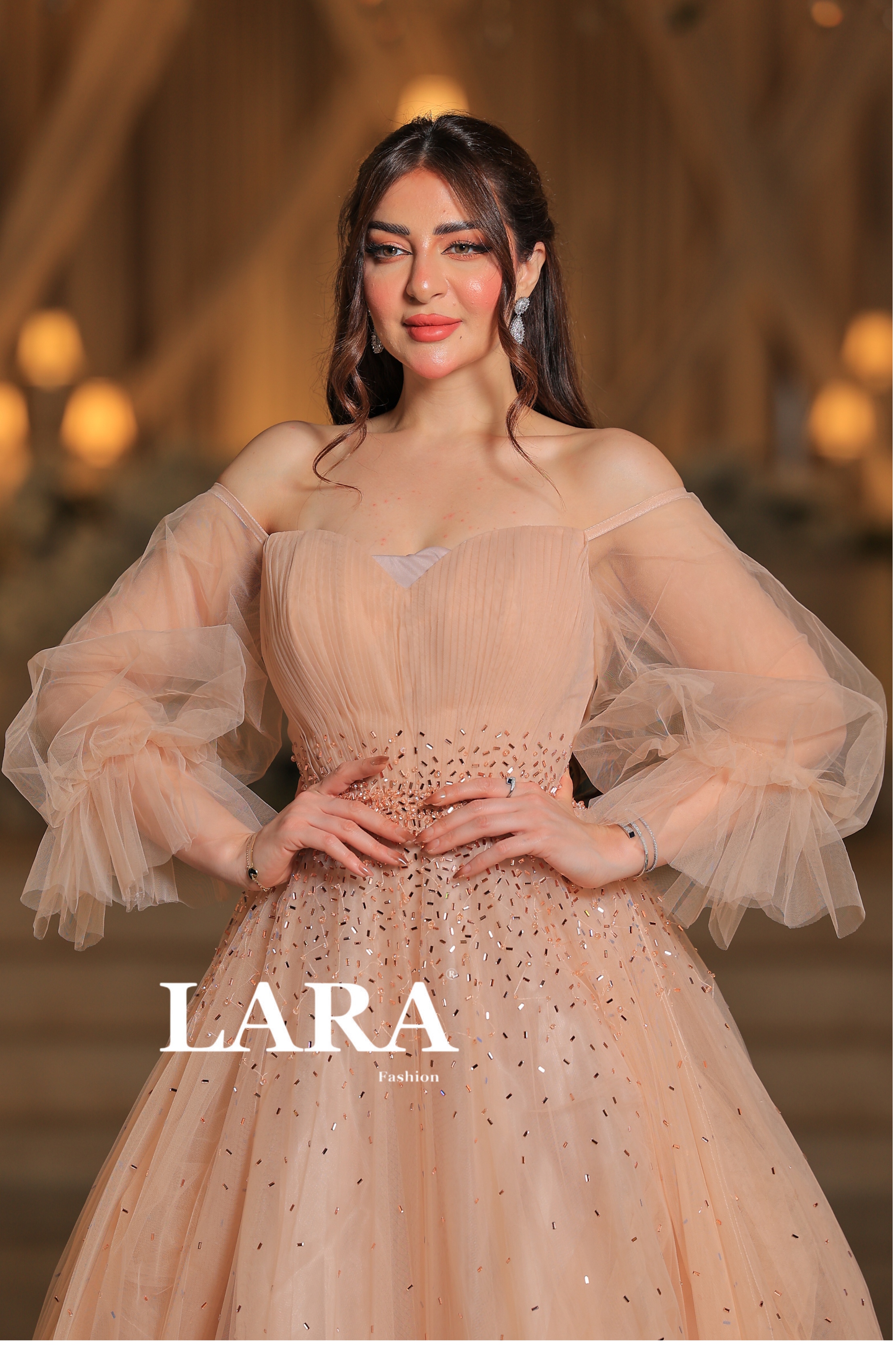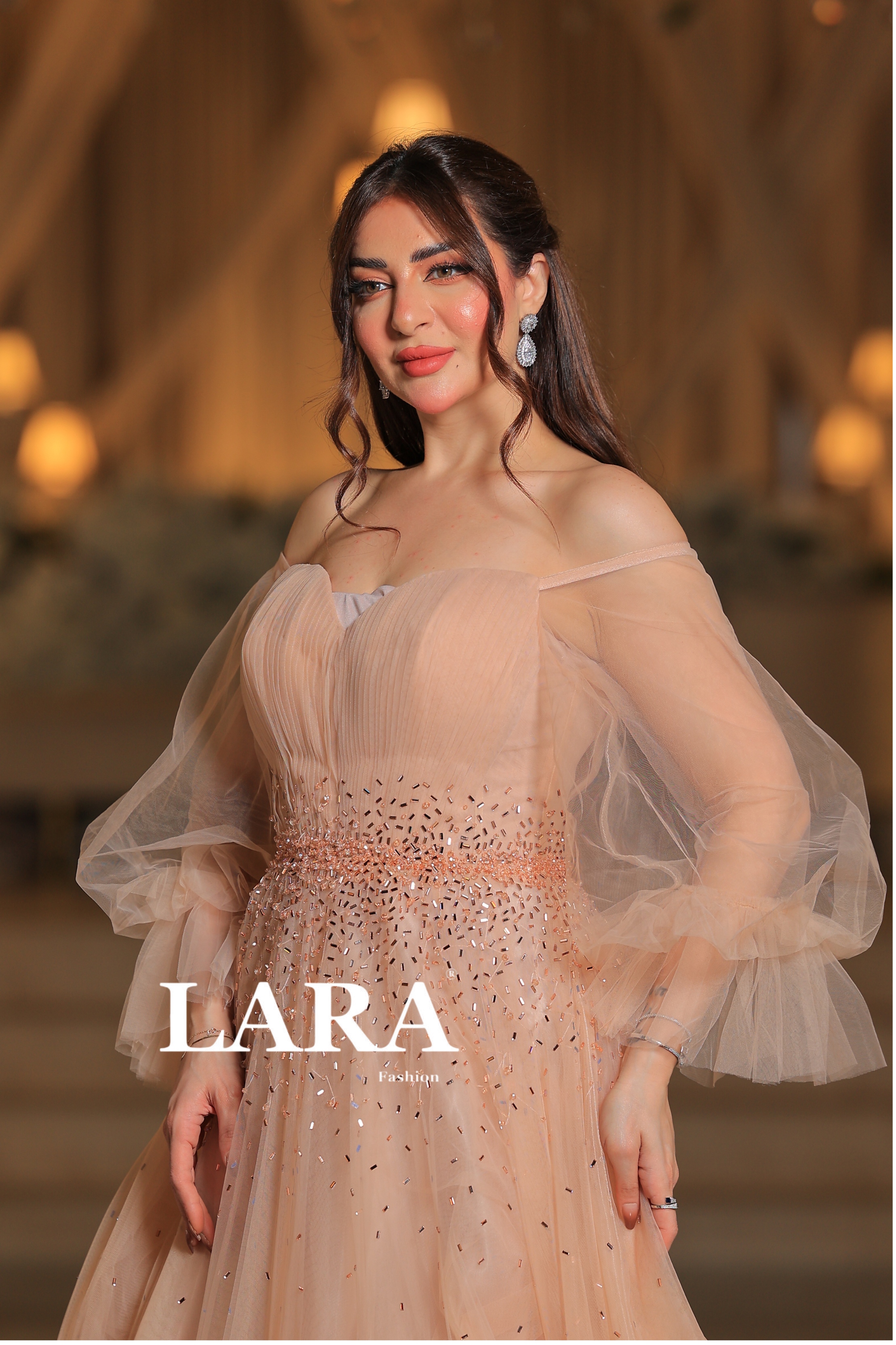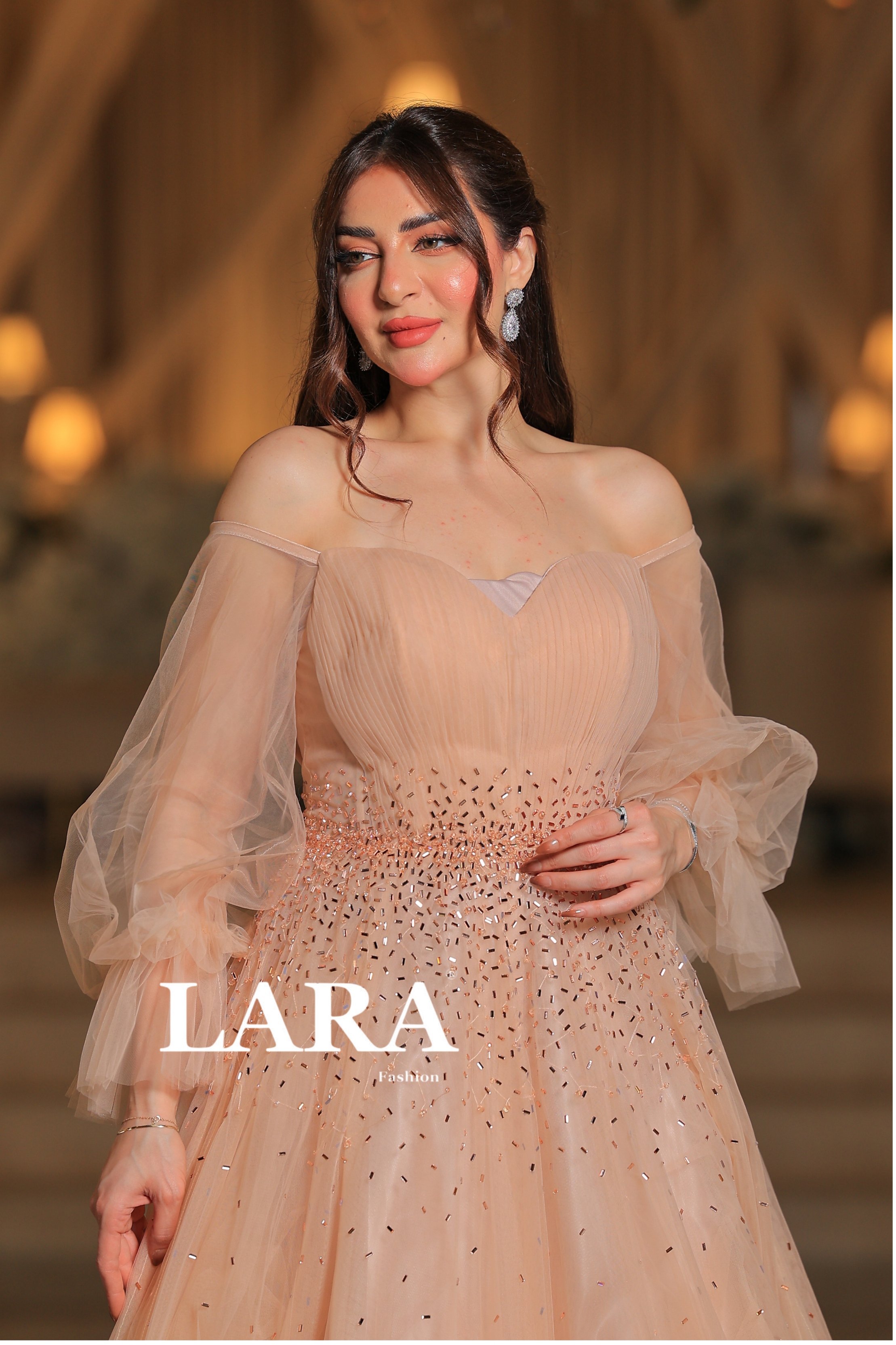 فستان يفيض أنوثة وأناقة، مصمم بلون لحمي ناعم يوحي بالهدوء والفخامة. يتميز بقصة أوف شولدر تبرز الأكتاف بأسلوب رومانسي ناعم