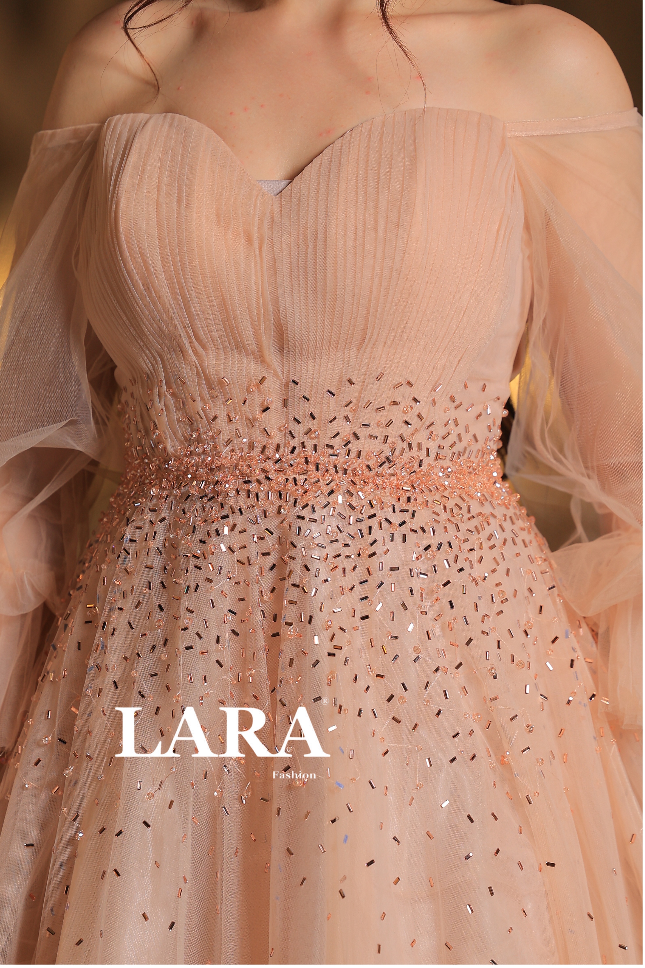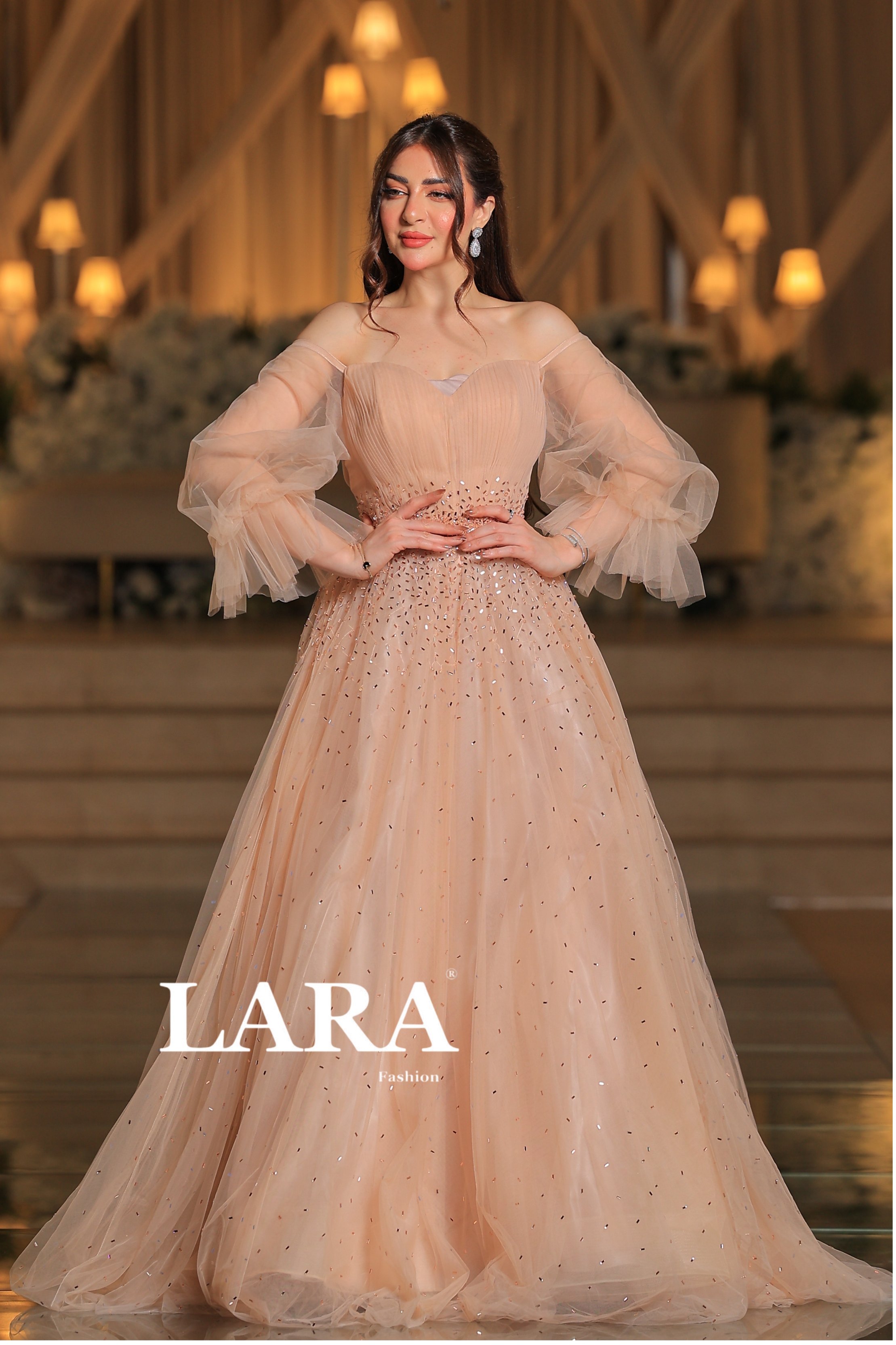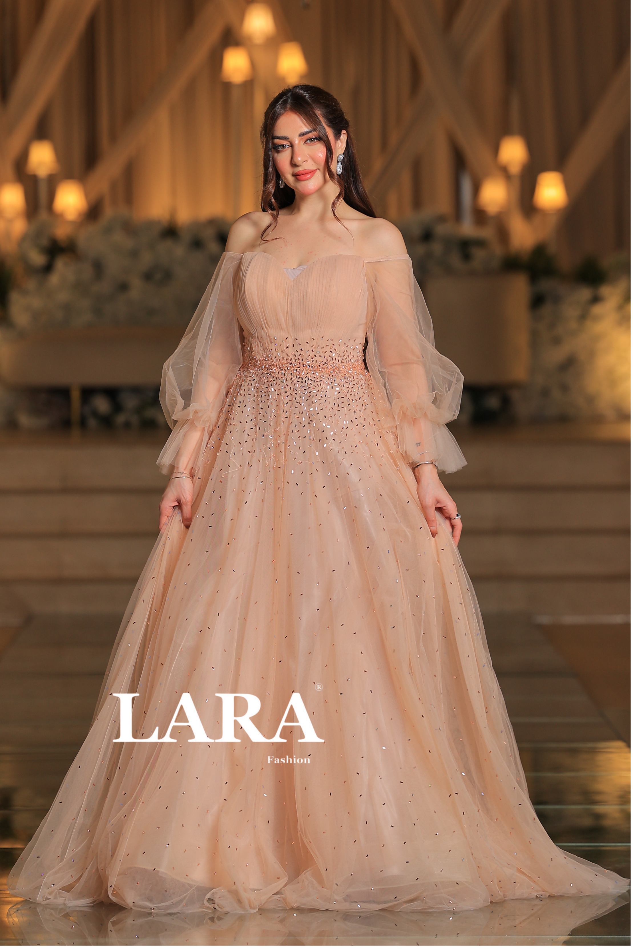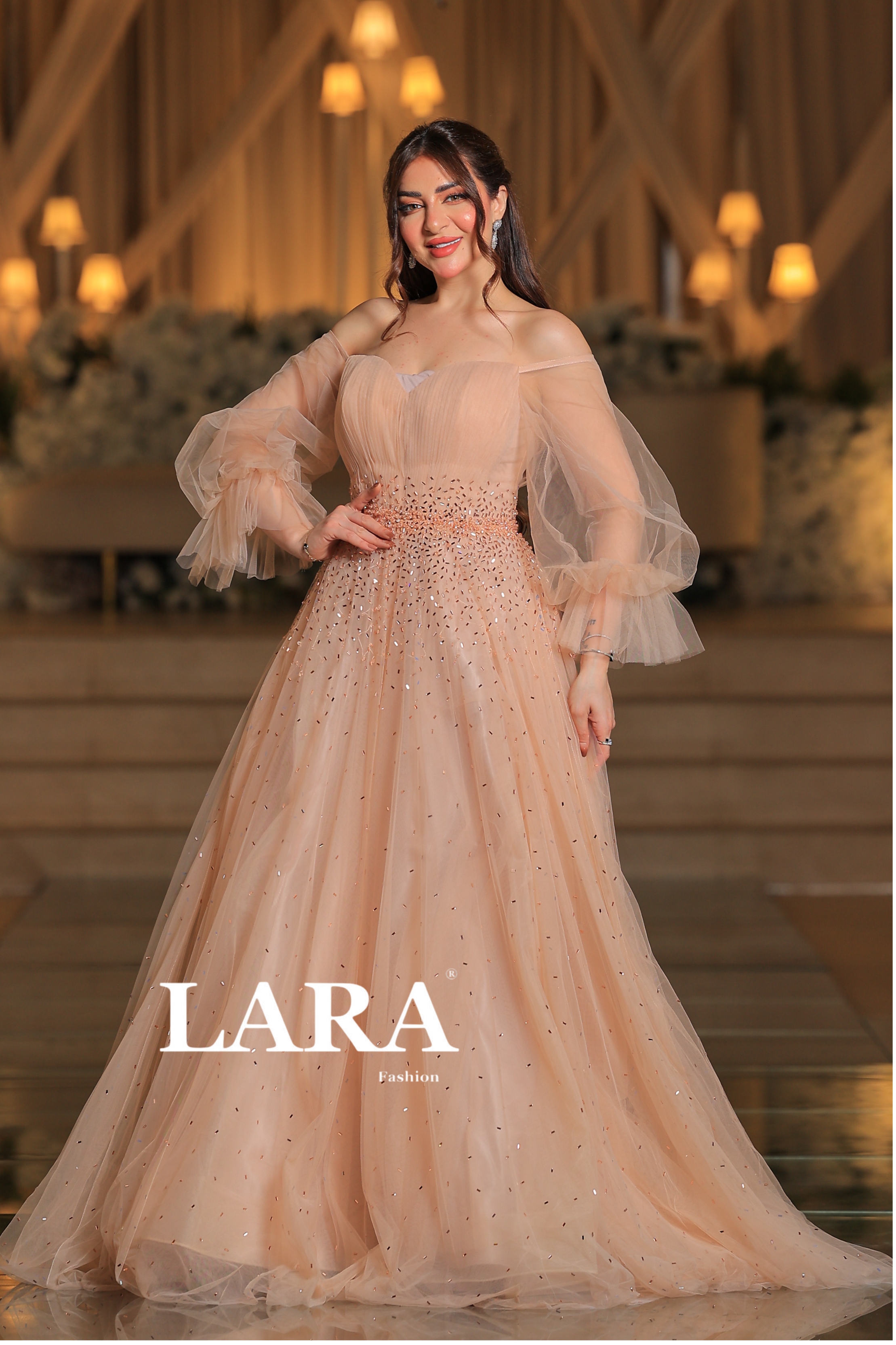 فستان يفيض أنوثة وأناقة، مصمم بلون لحمي ناعم يوحي بالهدوء والفخامة. يتميز بقصة أوف شولدر تبرز الأكتاف بأسلوب رومانسي ناعم