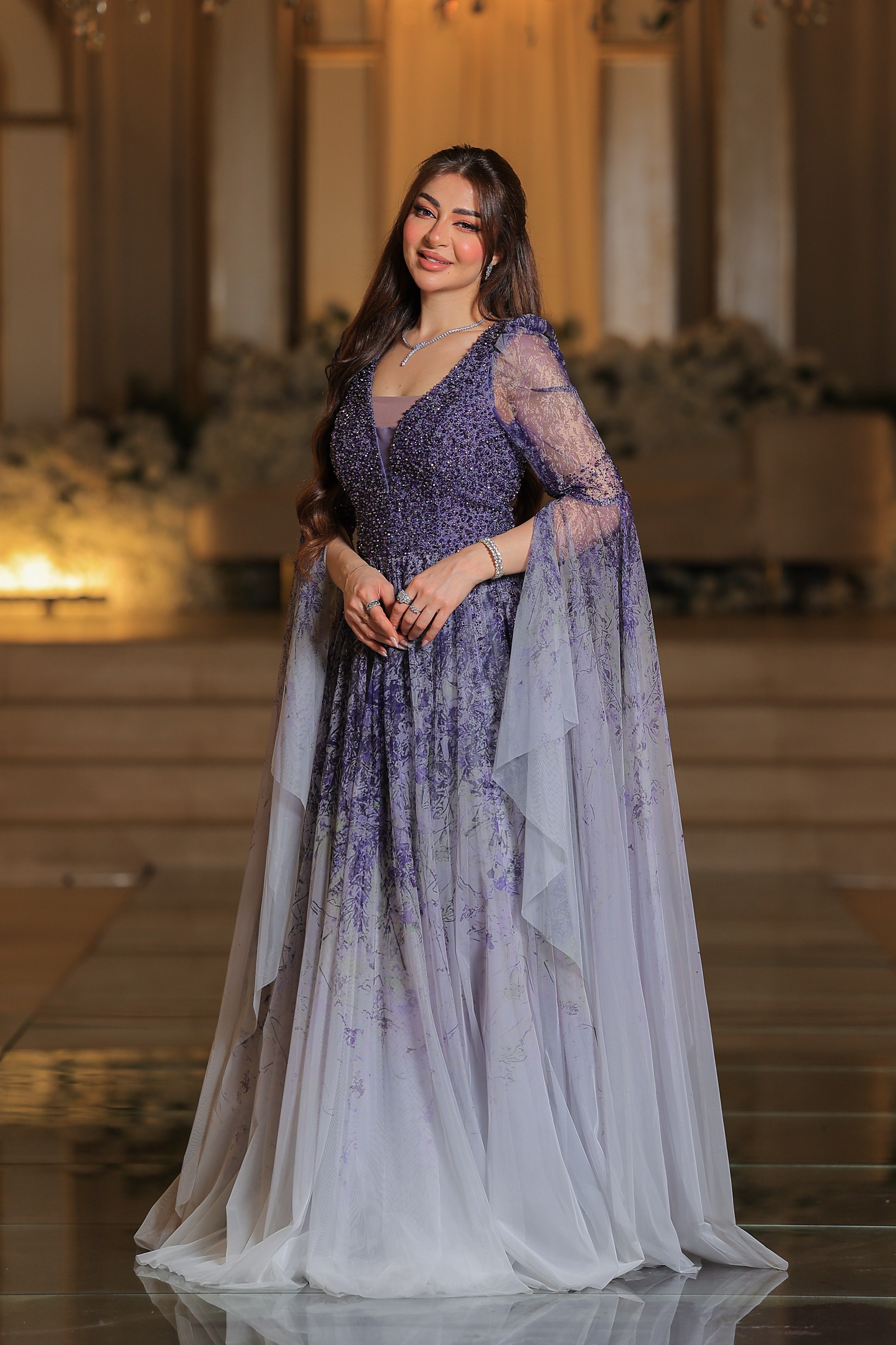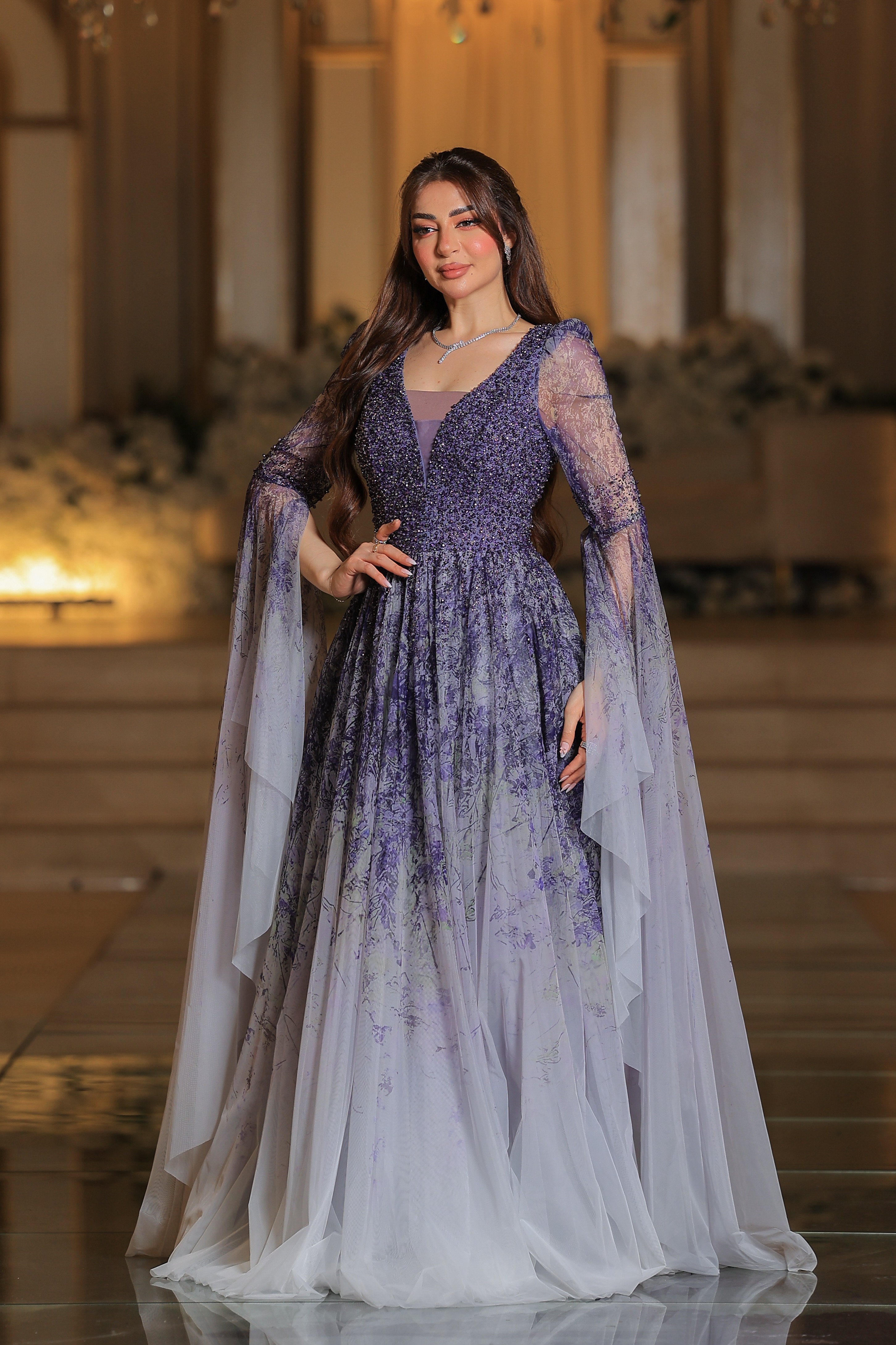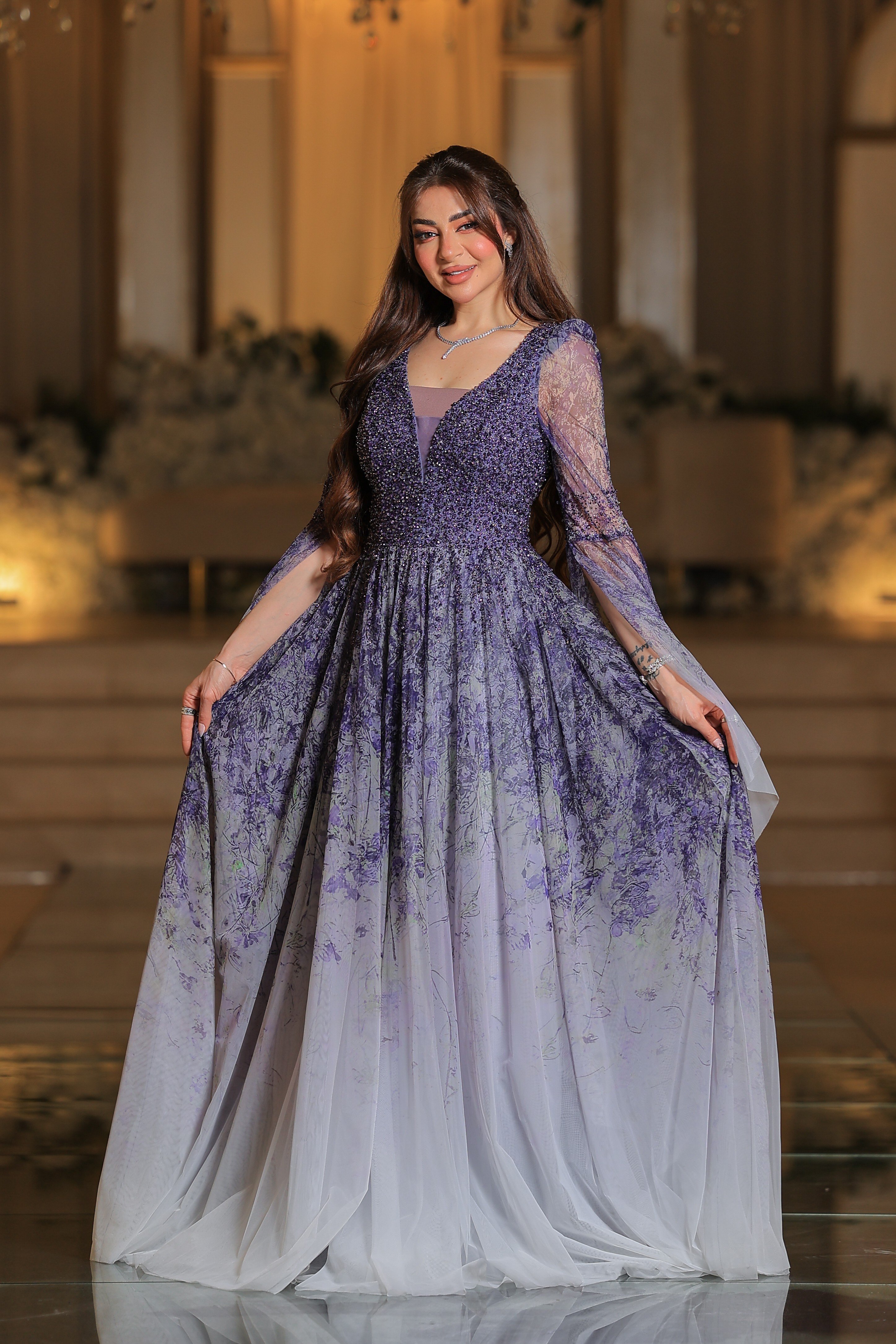 فستان يتميز بتصميم فاخر وأنثوي بلمسات رومانسية راقية. الجزء العلوي مزين بتطريزات دقيقة باللون البنفسجي، بأكمام طويلة شفافة تُضفي لمسة ناعمة وفخمة. تنورة الفستان واسعة ومنسدلة بطبقات من التول الشفاف، تتدرج ألوانها من الأخضر إلى درجات البيج الفاتح مع لمسات ناعمة من الزهور المرسومة بلون بنفجي لتعكس طابعاً طبيعياً ساحراً.