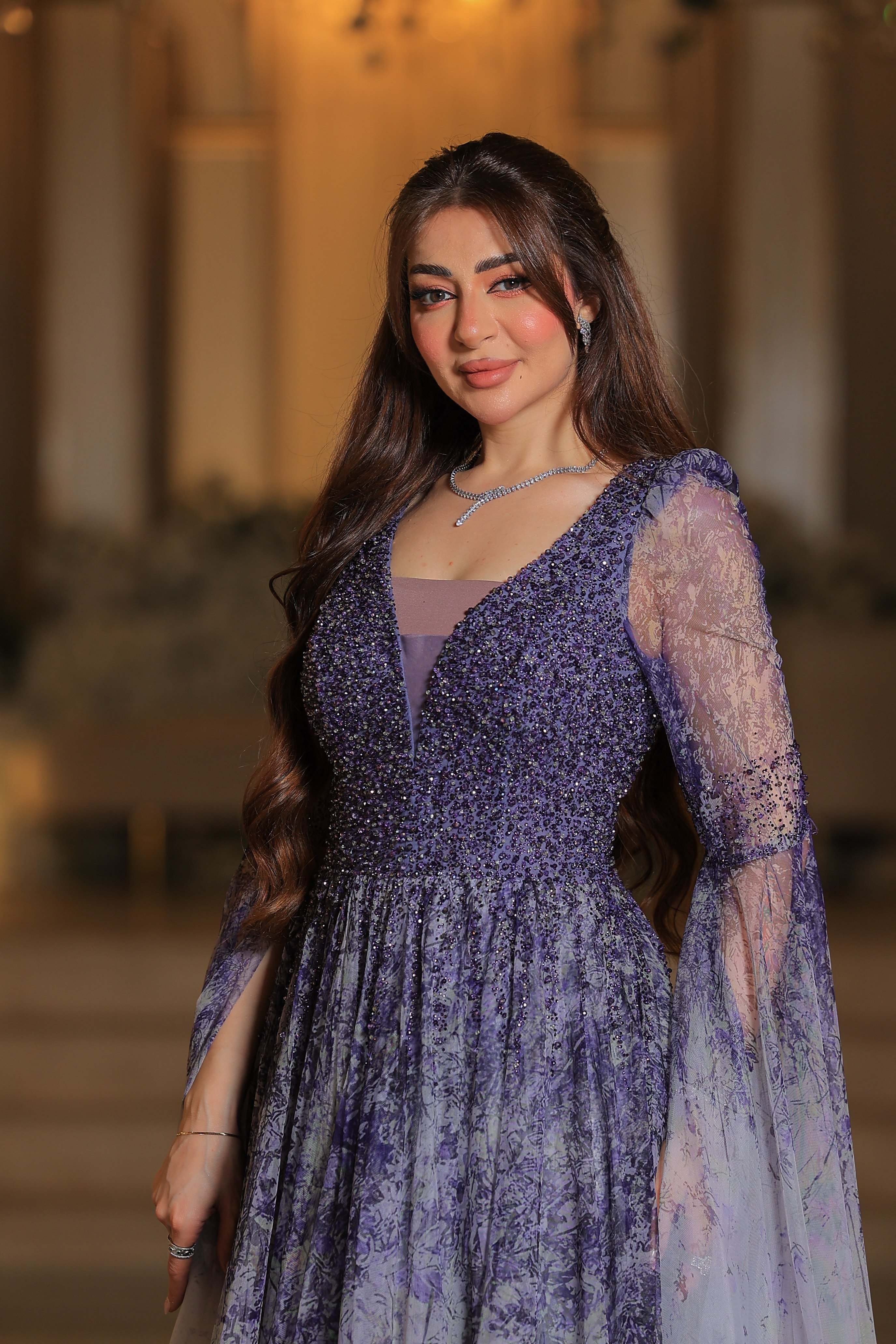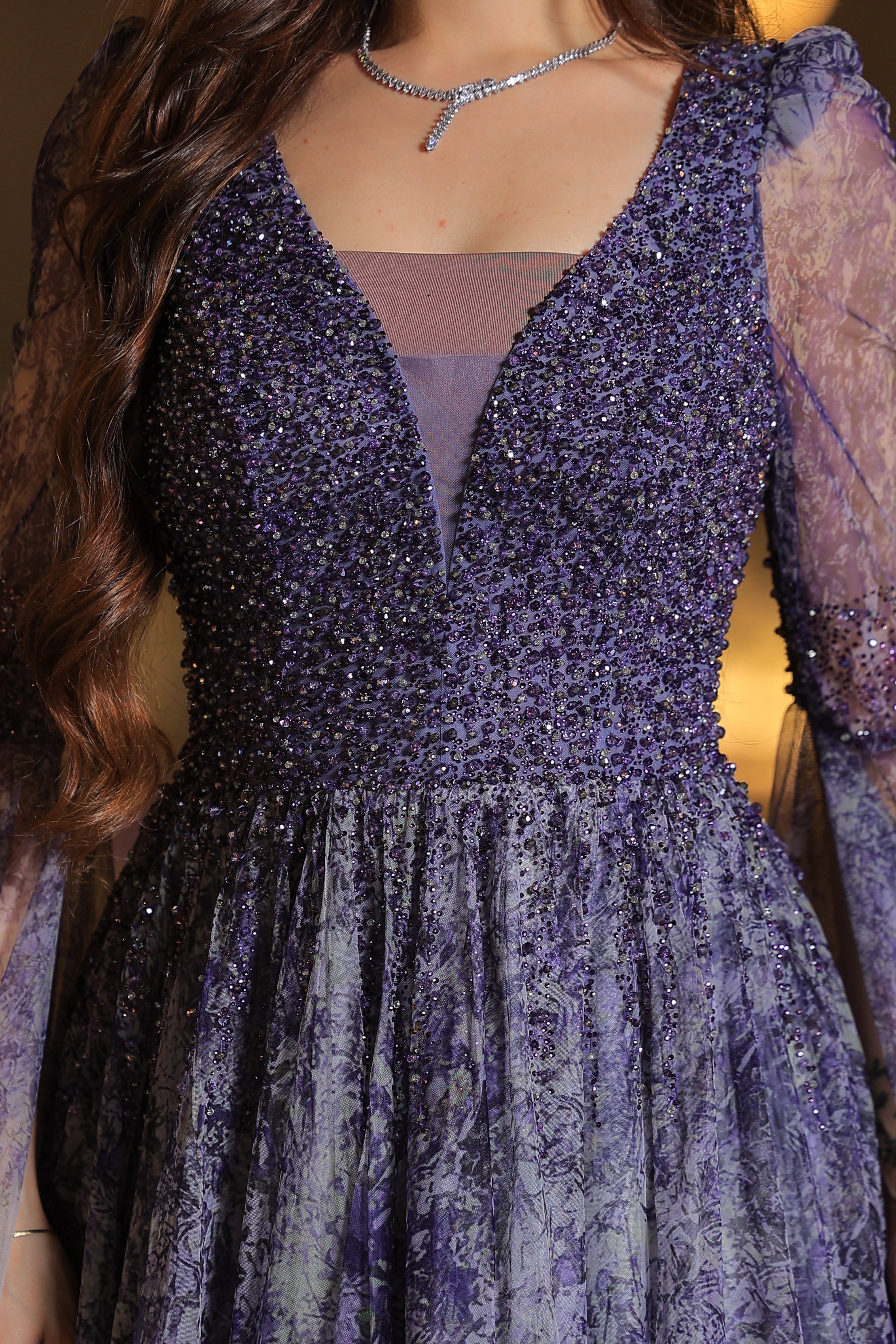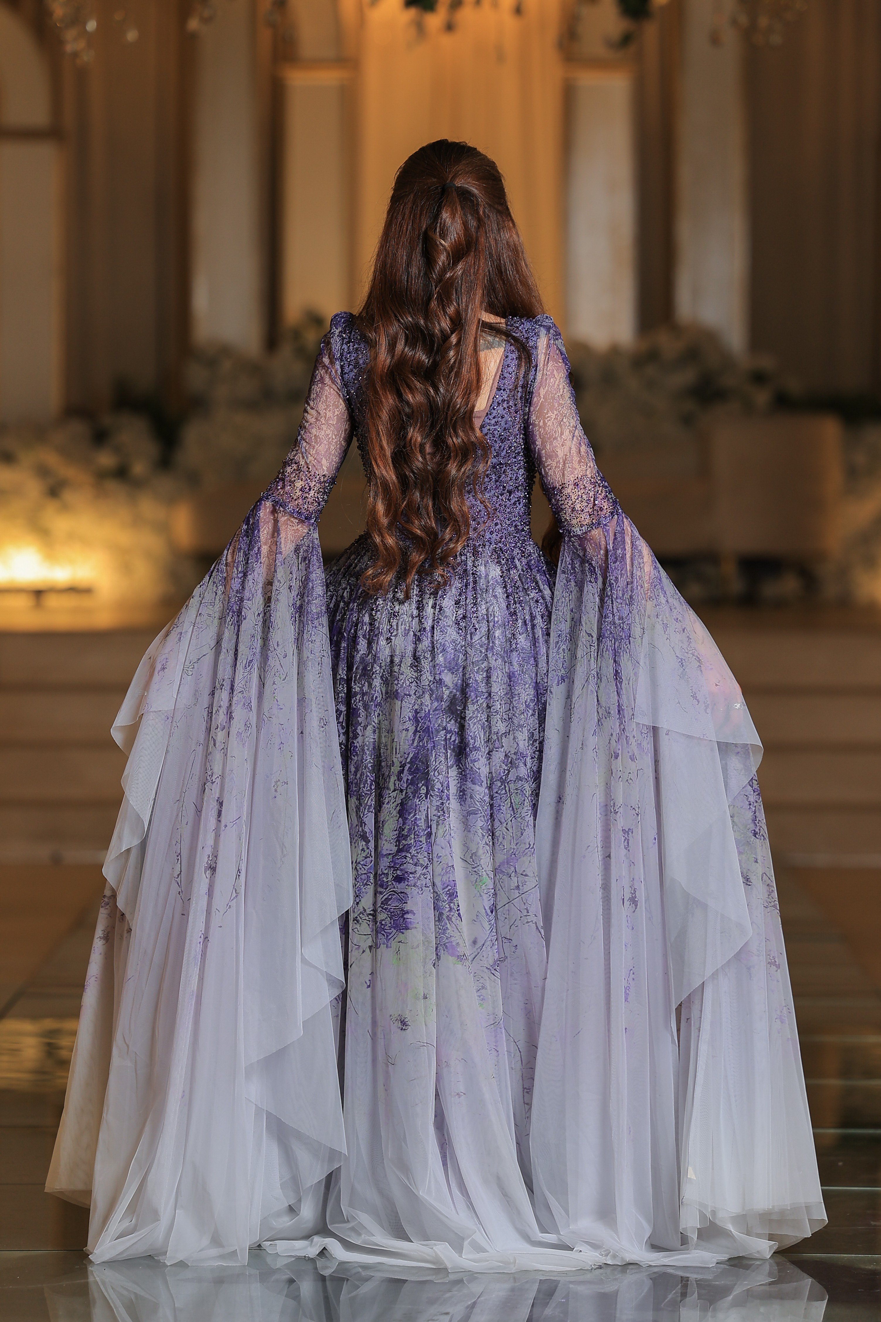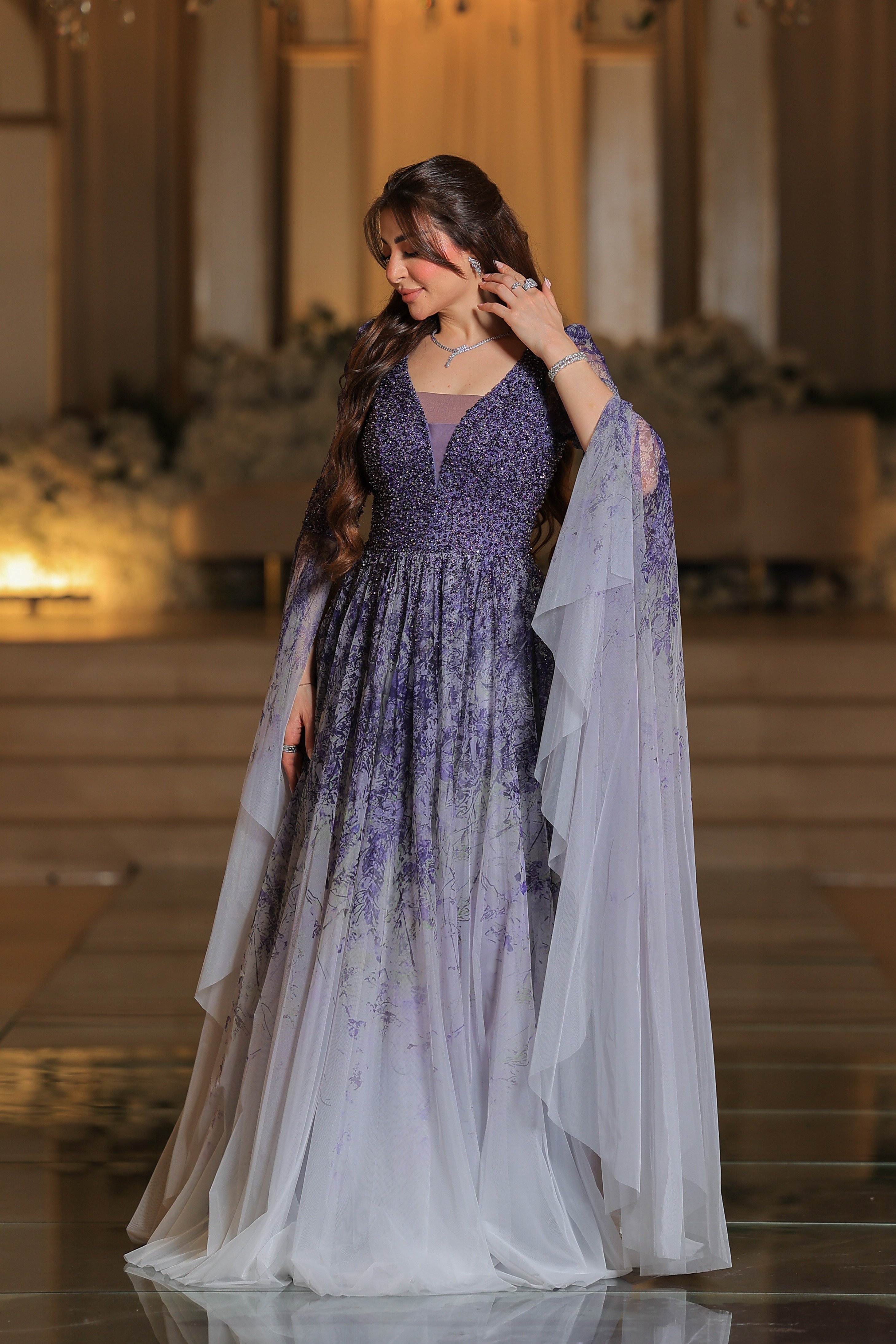فستان يتميز بتصميم فاخر وأنثوي بلمسات رومانسية راقية. الجزء العلوي مزين بتطريزات دقيقة باللون البنفسجي، بأكمام طويلة شفافة تُضفي لمسة ناعمة وفخمة. تنورة الفستان واسعة ومنسدلة بطبقات من التول الشفاف، تتدرج ألوانها من الأخضر إلى درجات البيج الفاتح مع لمسات ناعمة من الزهور المرسومة بلون بنفجي لتعكس طابعاً طبيعياً ساحراً.