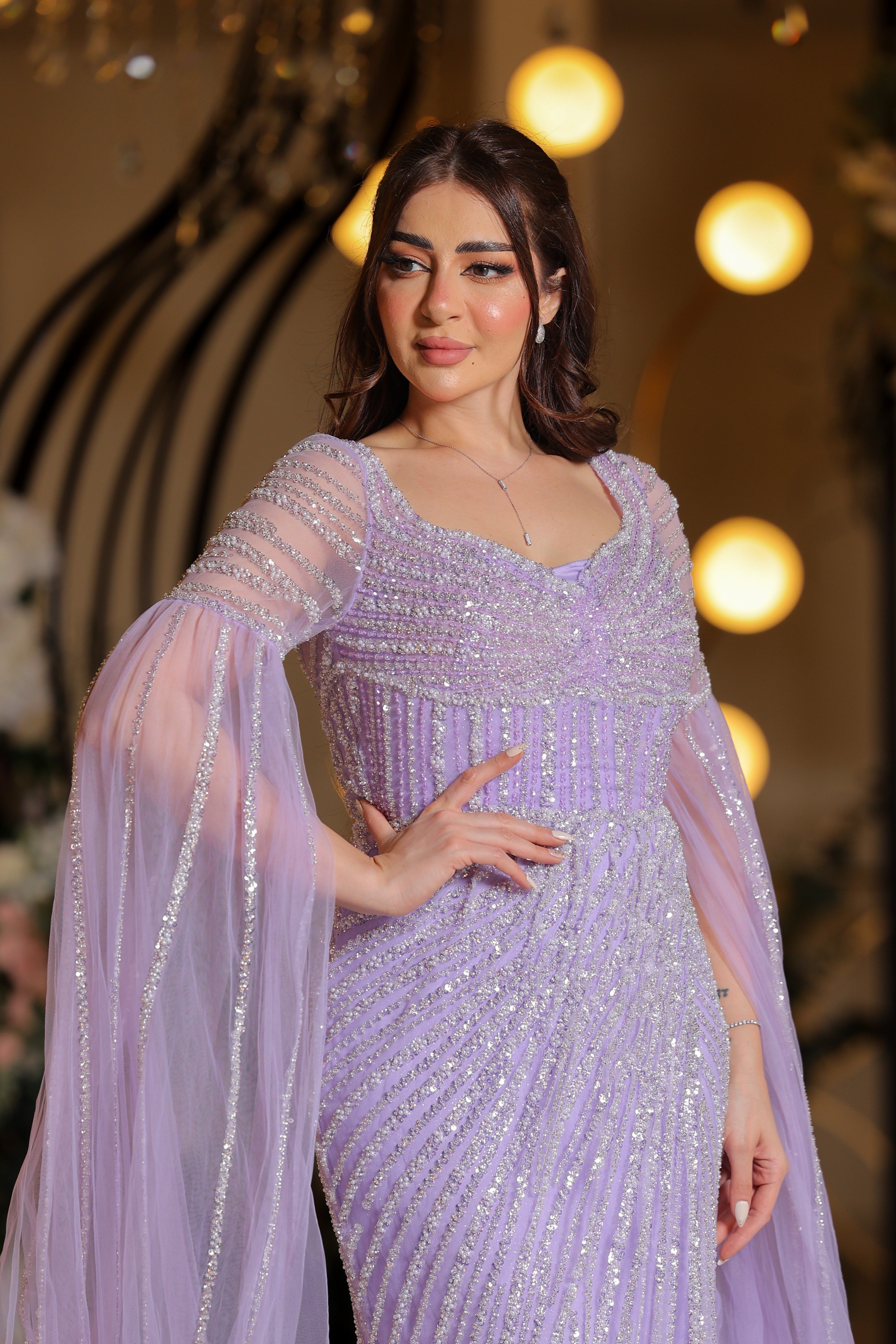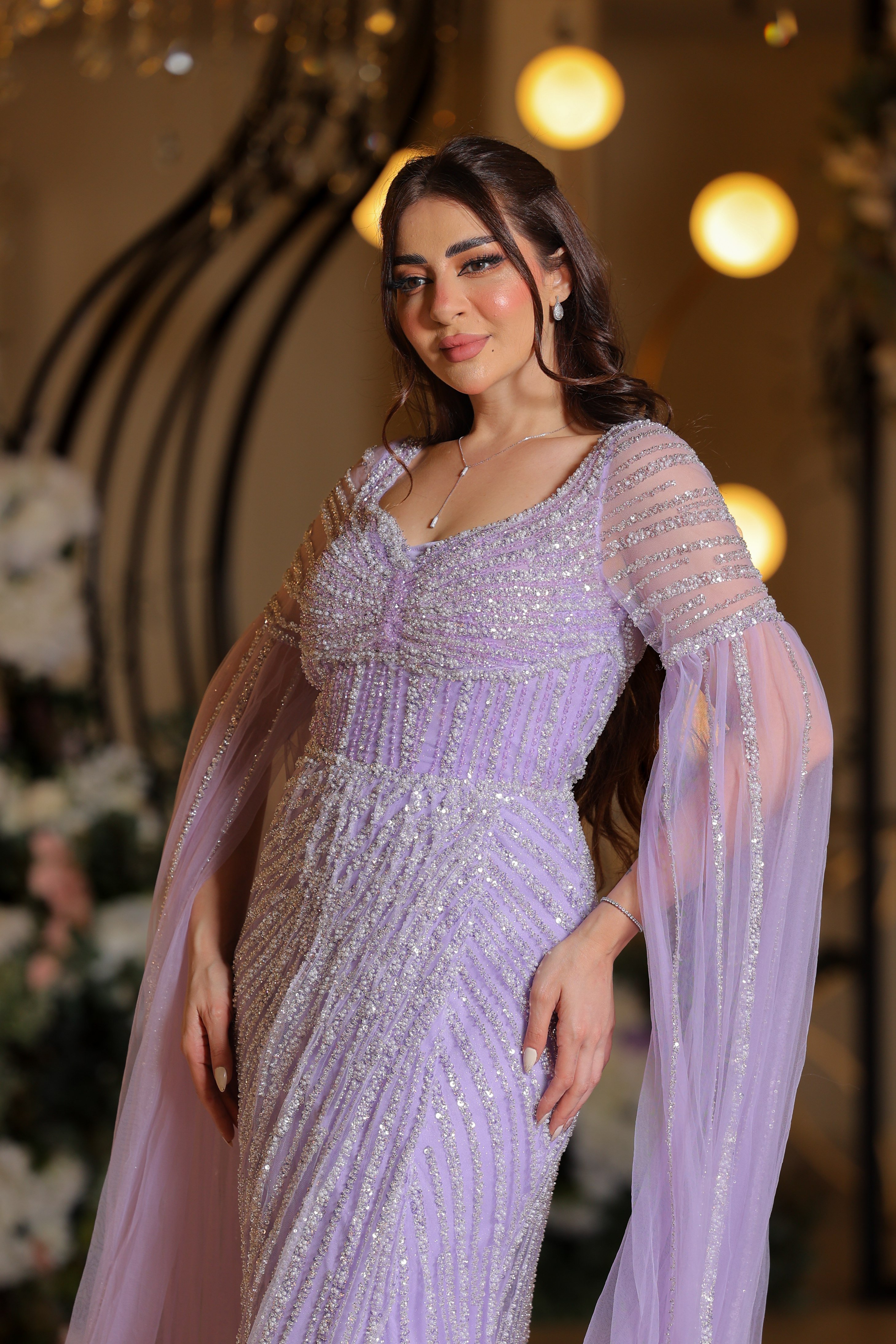 فستان سهرة مطرز بالخرز بفتحه ساق واكمام كيب