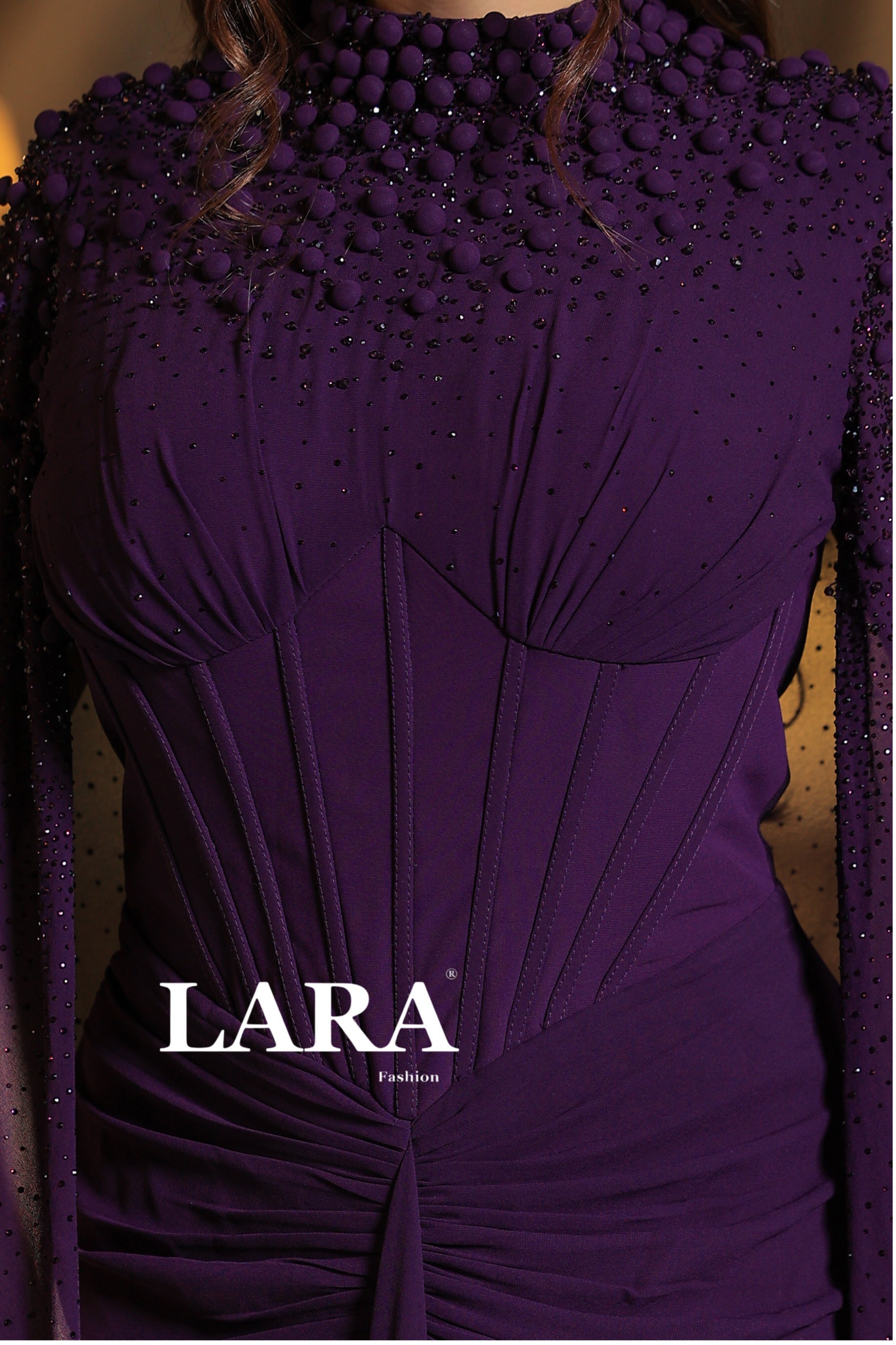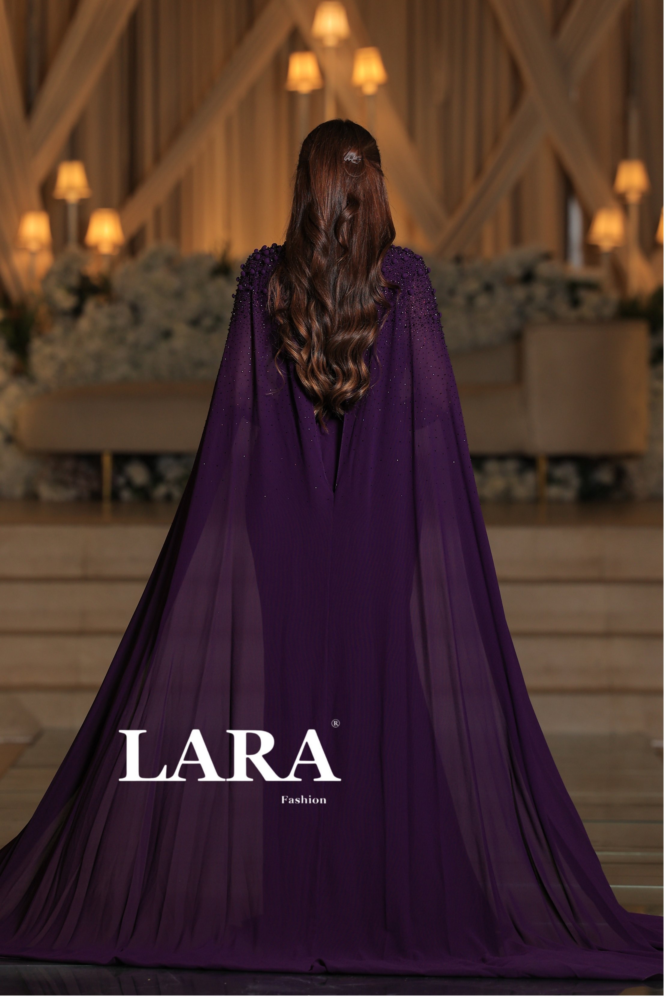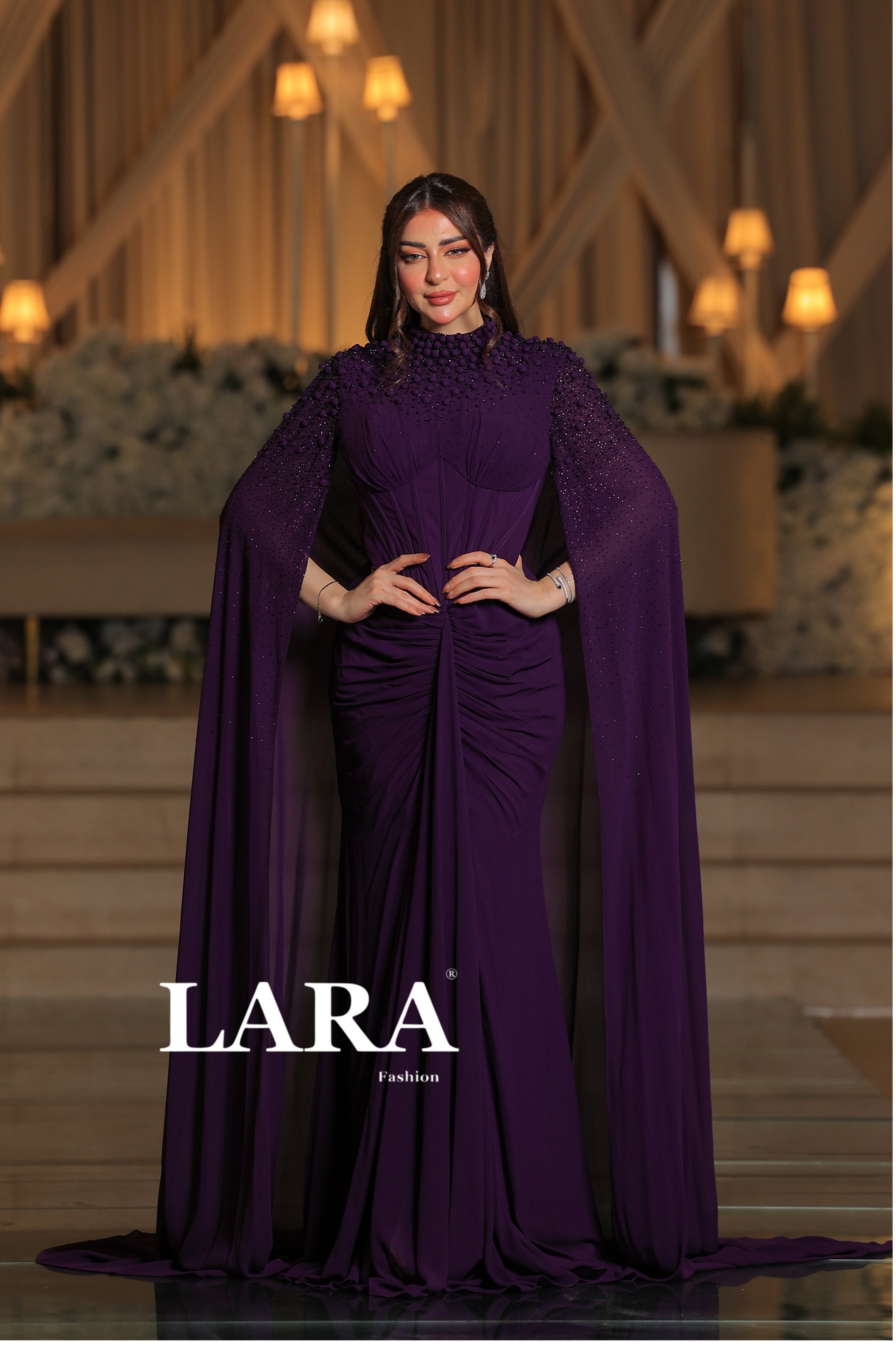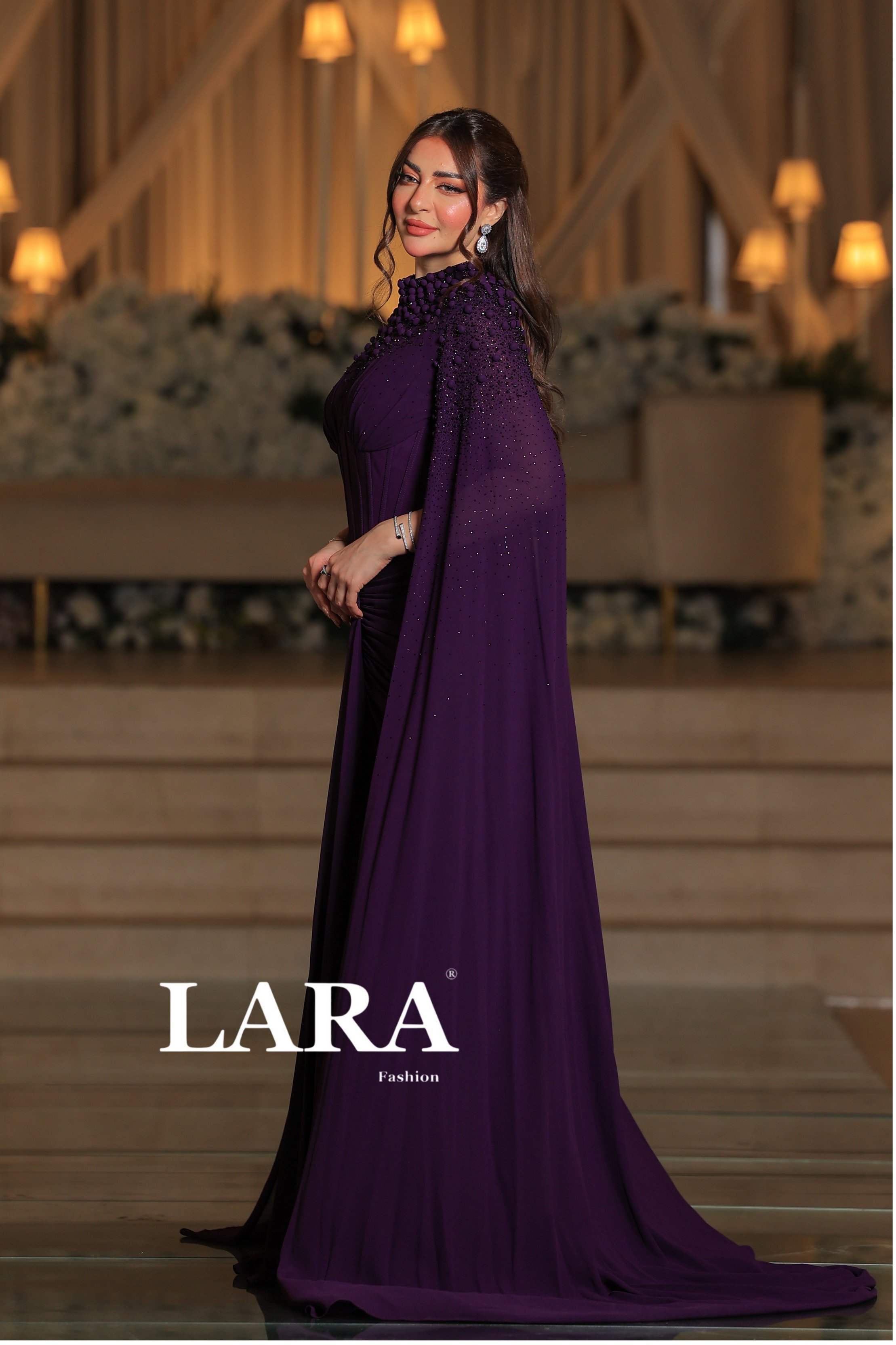 فستان ملكي بلون بنفسجي، يجمع بين الفخامة والرقي. يتميز بتفصيل ضيق يبرز جمال القوام، مع كسرات جذابة من الأمام تُضفي لمسة أنثوية راقية