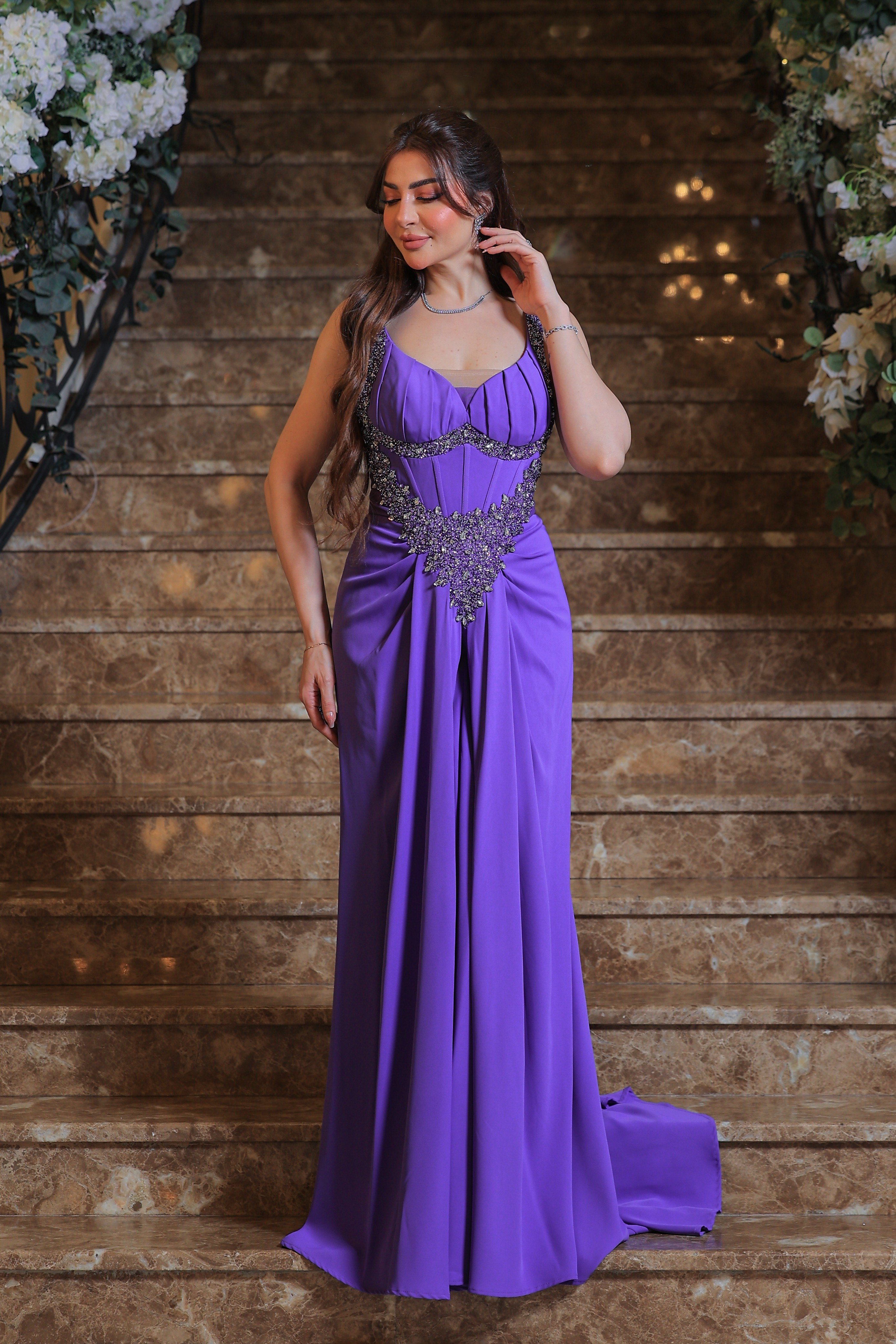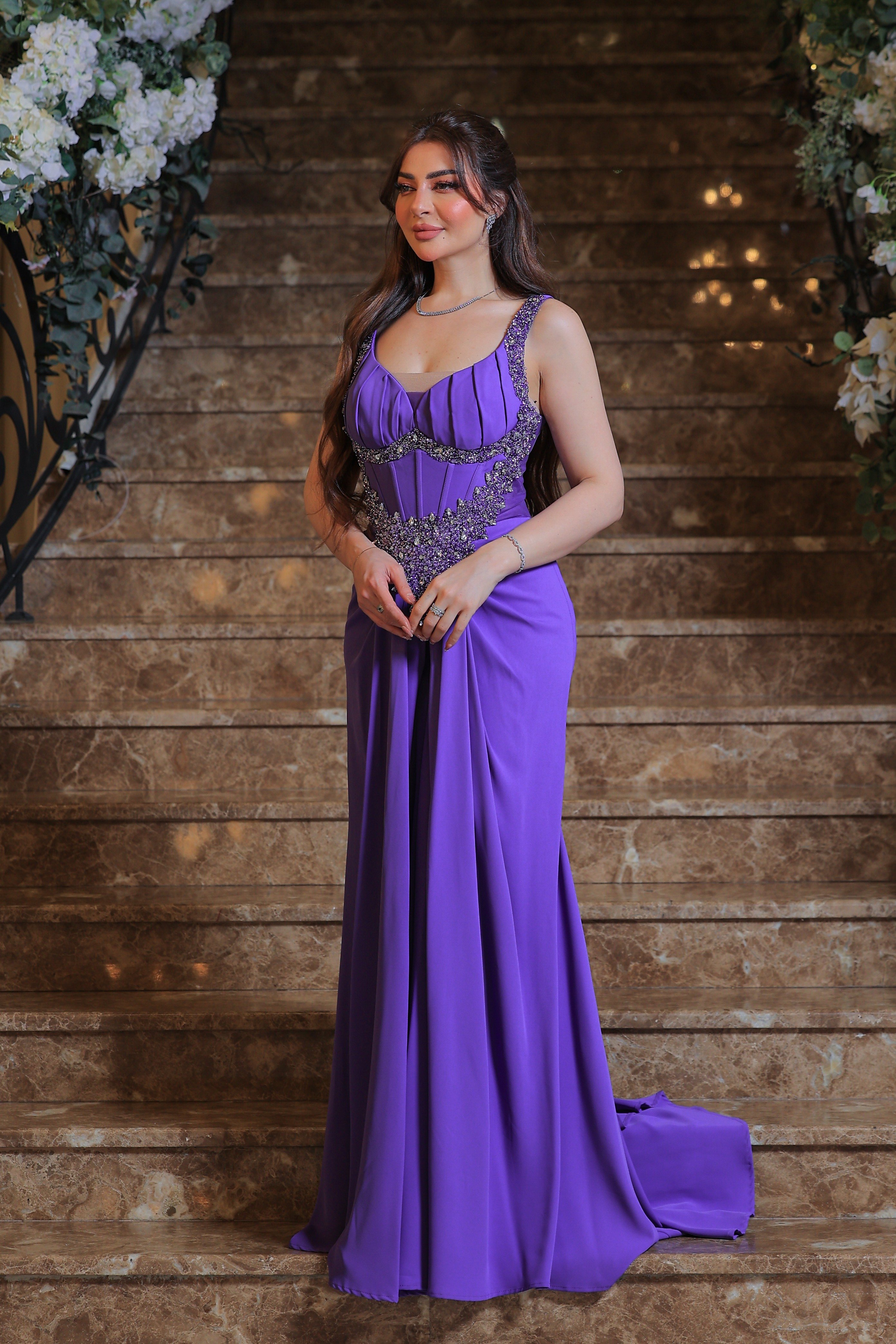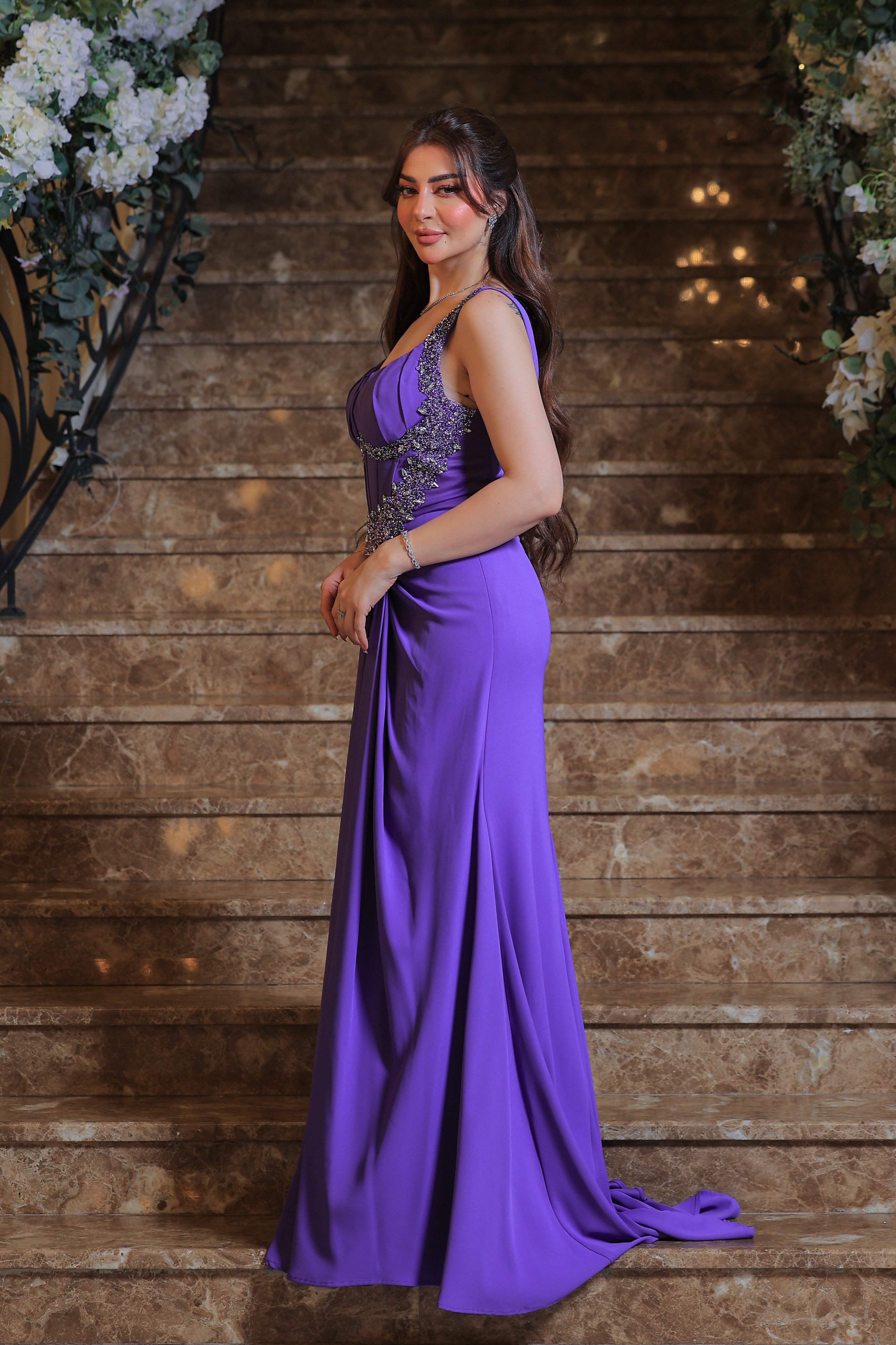 فستان بلون بنفسجي فاخر بتصميم سهرة أنيق، يتميز بقصّة ضيقة من الأعلى مع حمالات عريضة مرصعة بتطريزات فضية لامعة تضيف لمسة فخامة، مع إبراز منطقة الخصر بتطريز متدلي على شكل V يضفي مظهراً أنثوياً جذاباً. التنورة منسدلة بانسيابية مع كسرات ناعمة تمنح حرية الحركة ورقياً في الإطلالة.