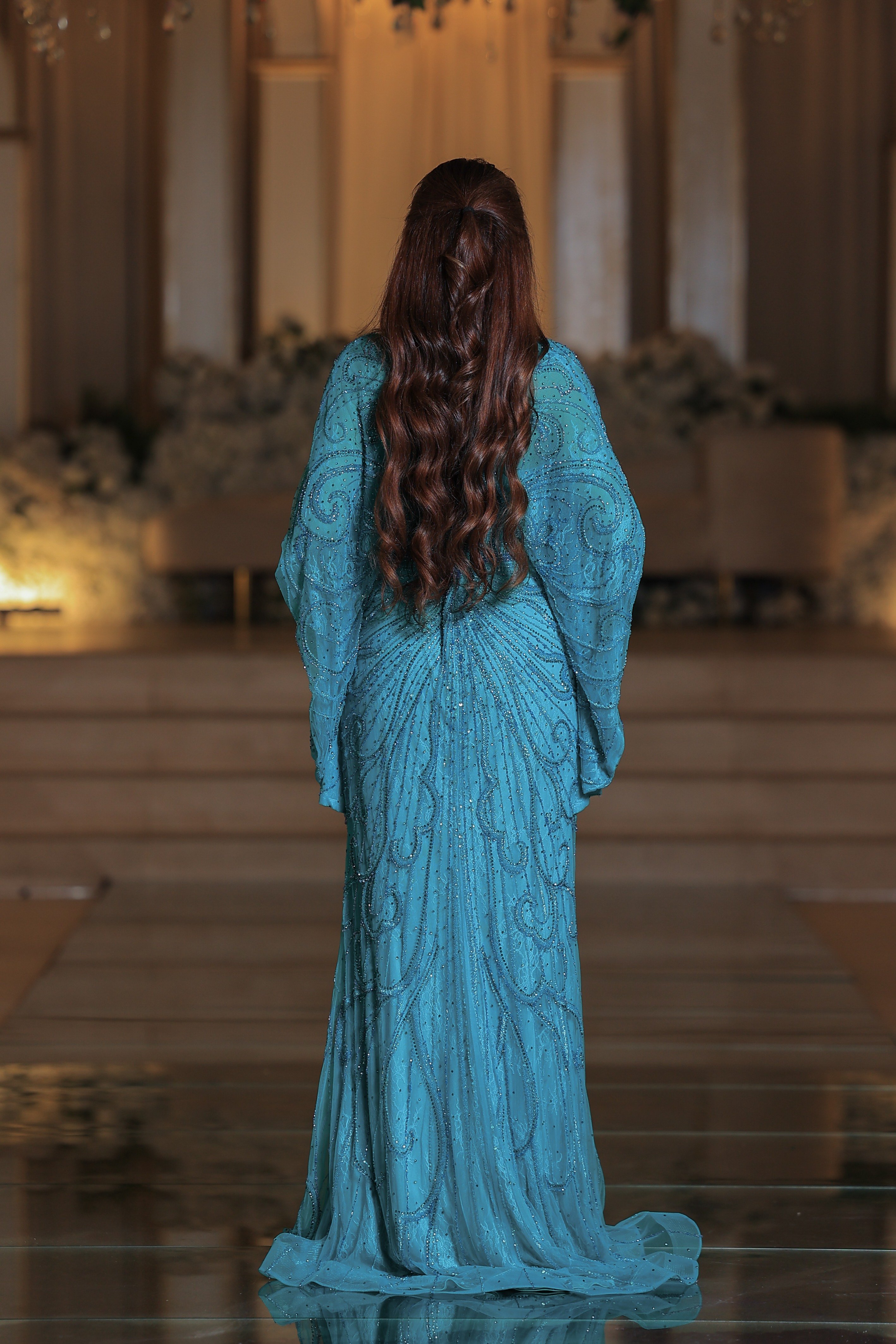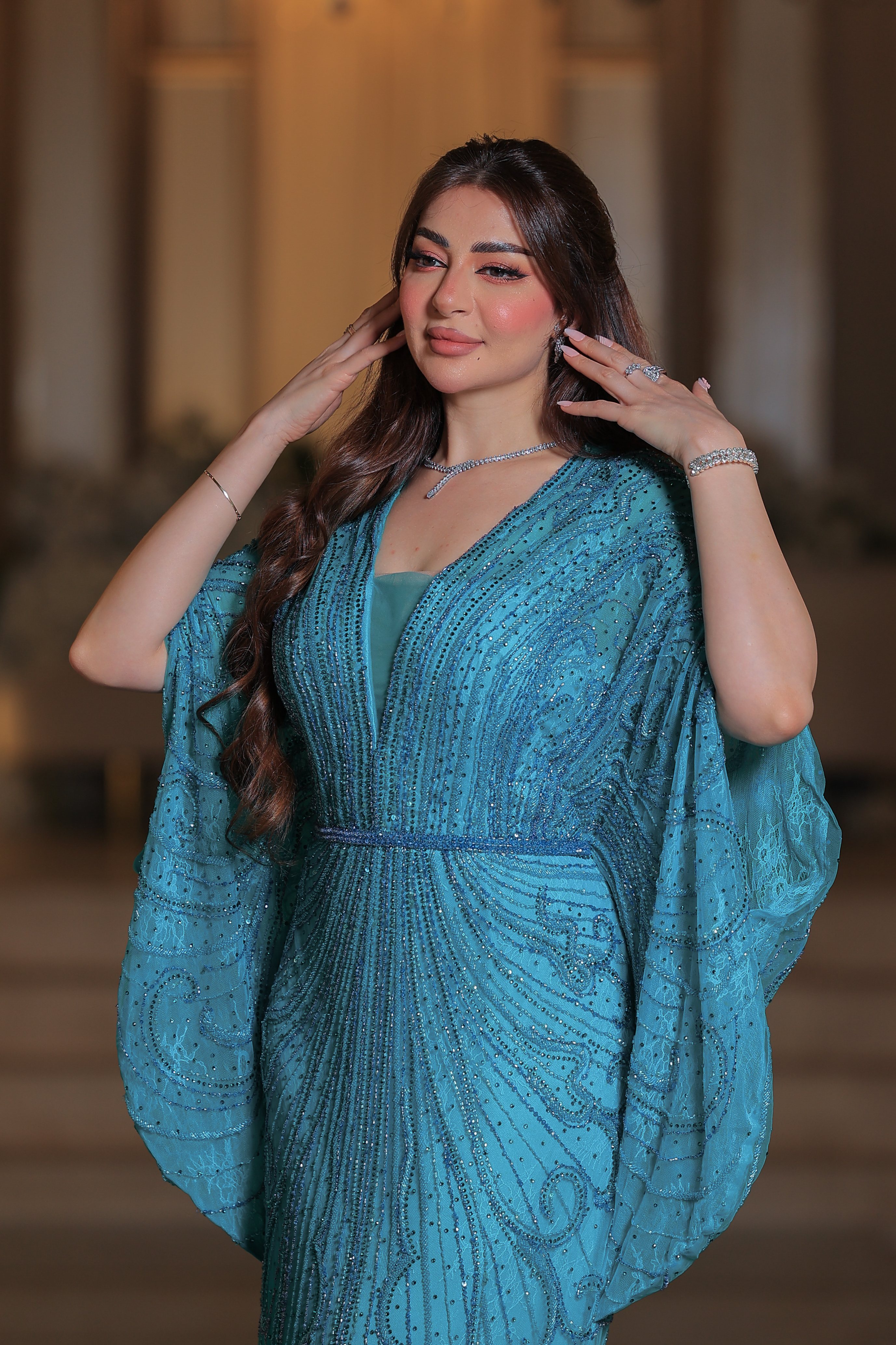 فستان سهرة بلون فيروزي ملكي يخطف الأنظار