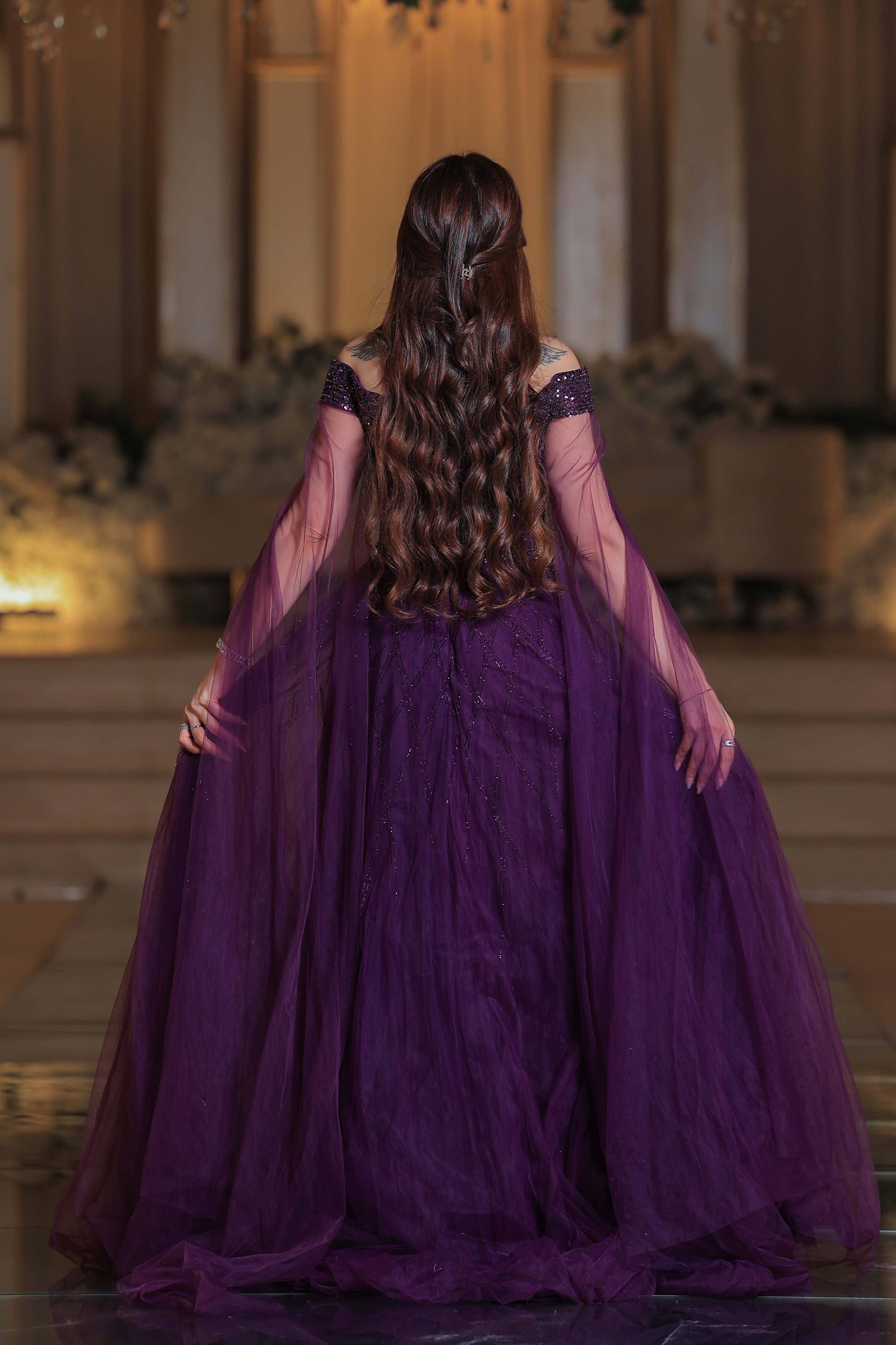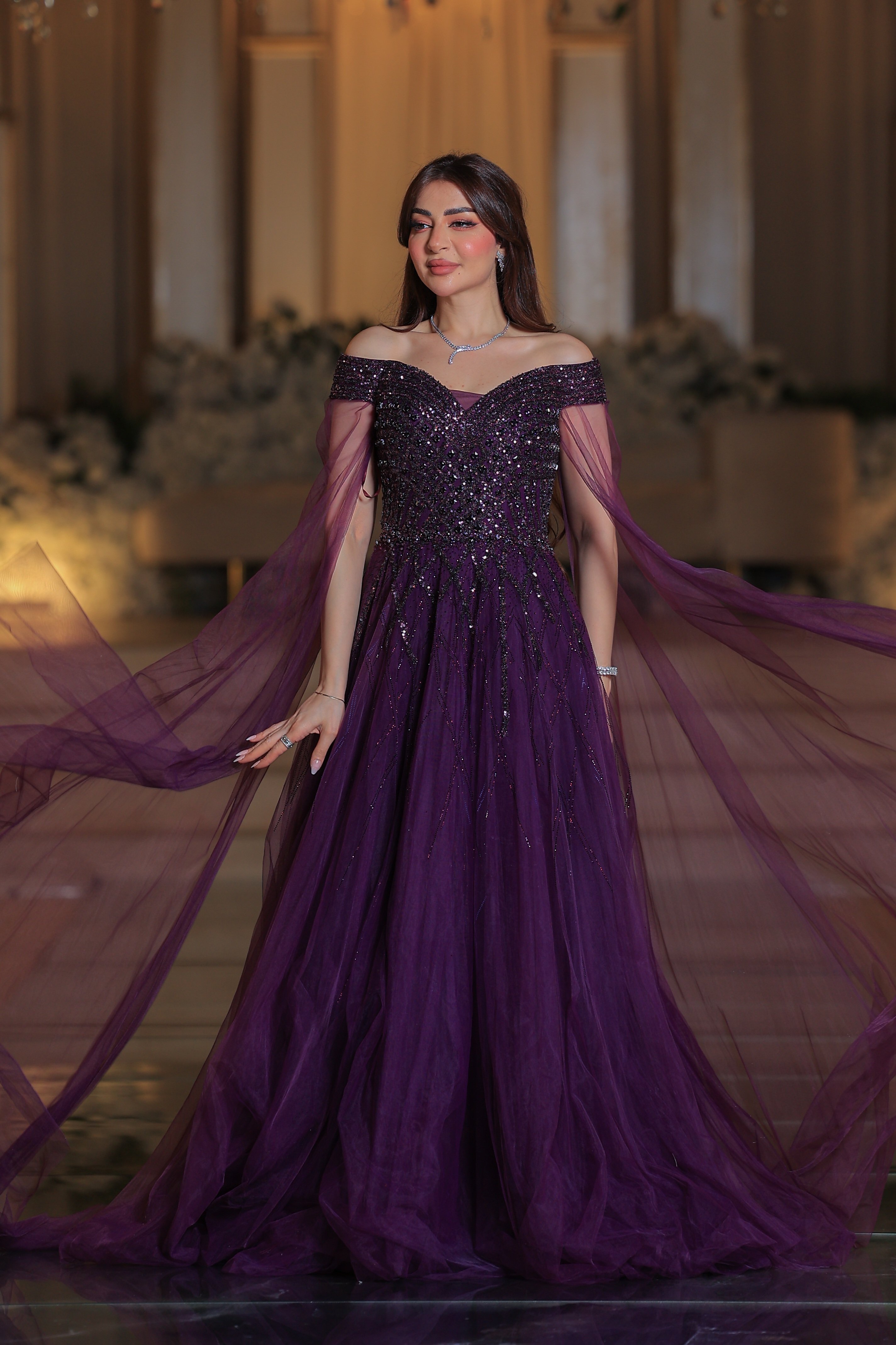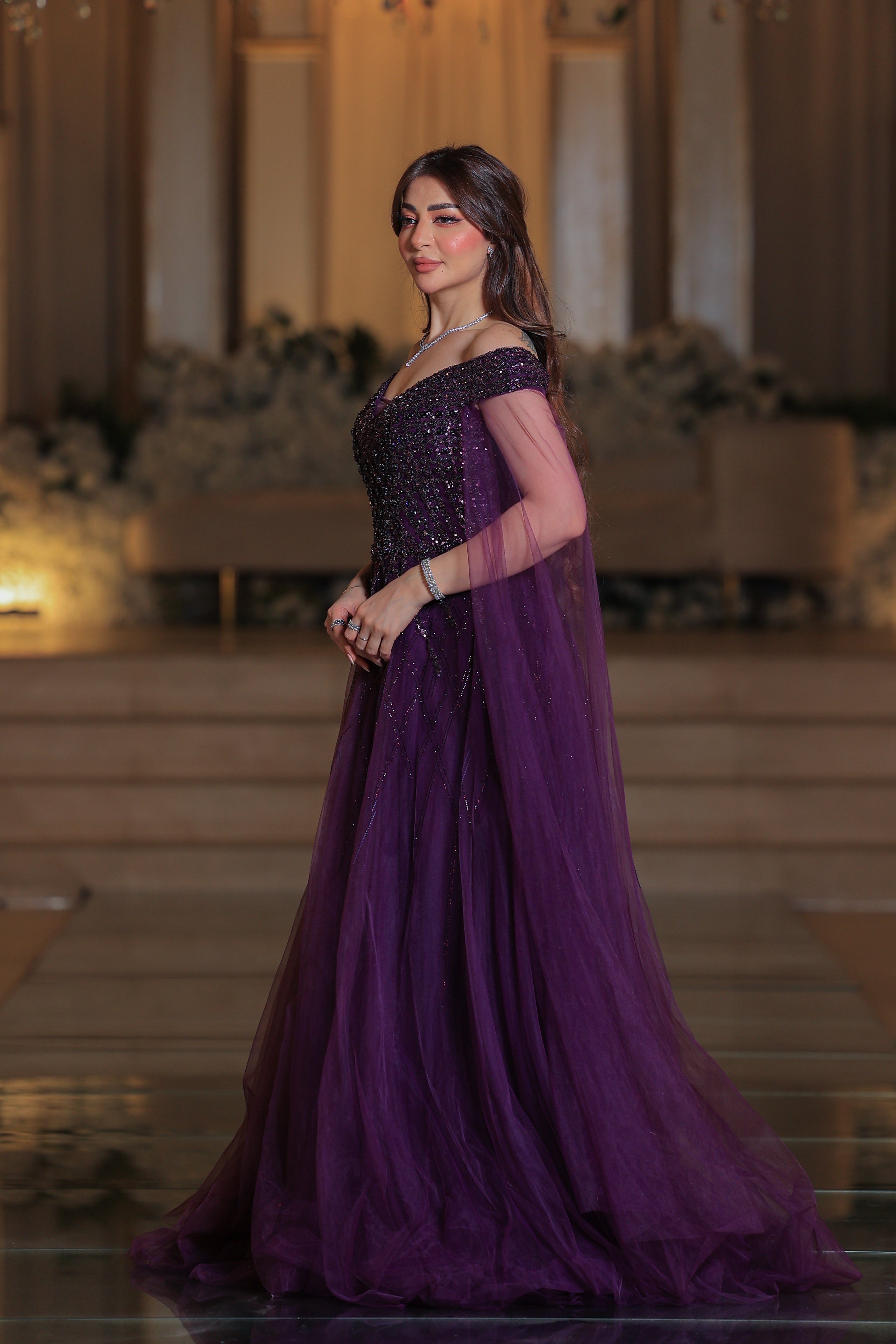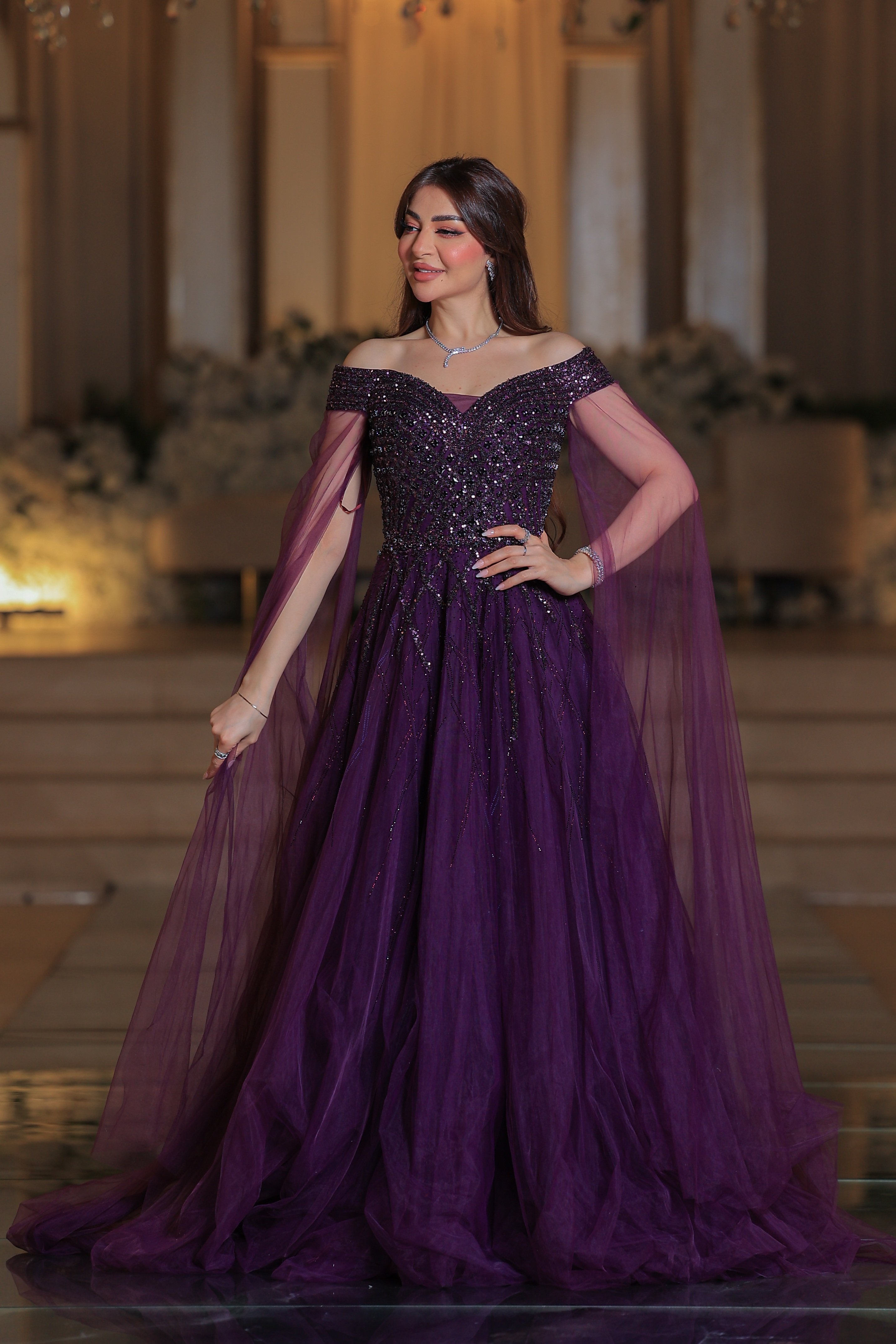 * الأكمام: لا يوجد أكمام بالمعنى التقليدي، ولكنه مزود بكاب أو وشاح شفاف طويل ينسدل من الأكتاف وصولاً إلى الأرض، مما يضفي لمسة ملكية وأناقة.