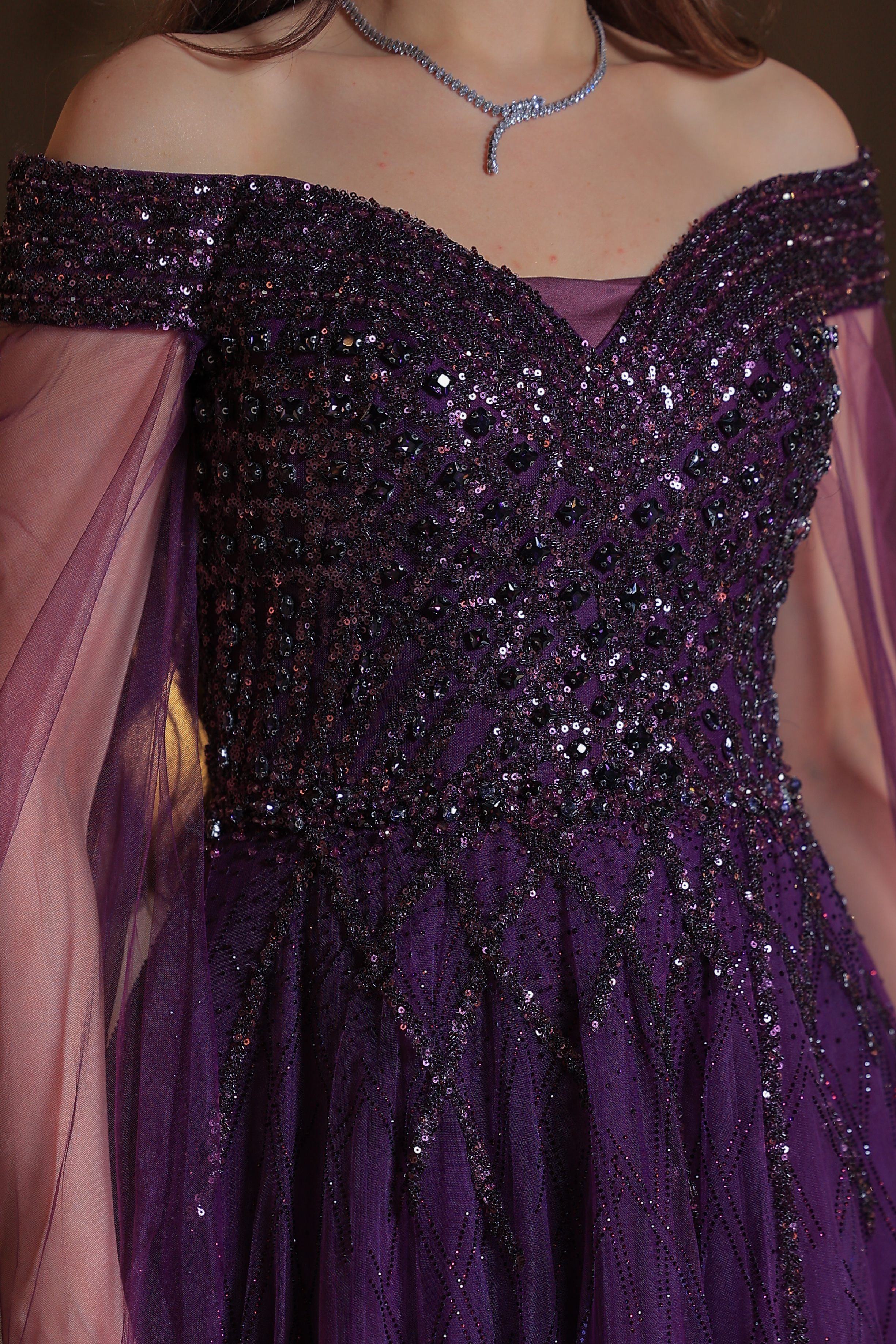 * التفاصيل: التطريزات البراقة تغطي الصدر والجزء العلوي من الفستان بالكامل، وتستمر بشكل متناثر على طول التنورة، مما يعطي إحساساً باللمعان والتألق.