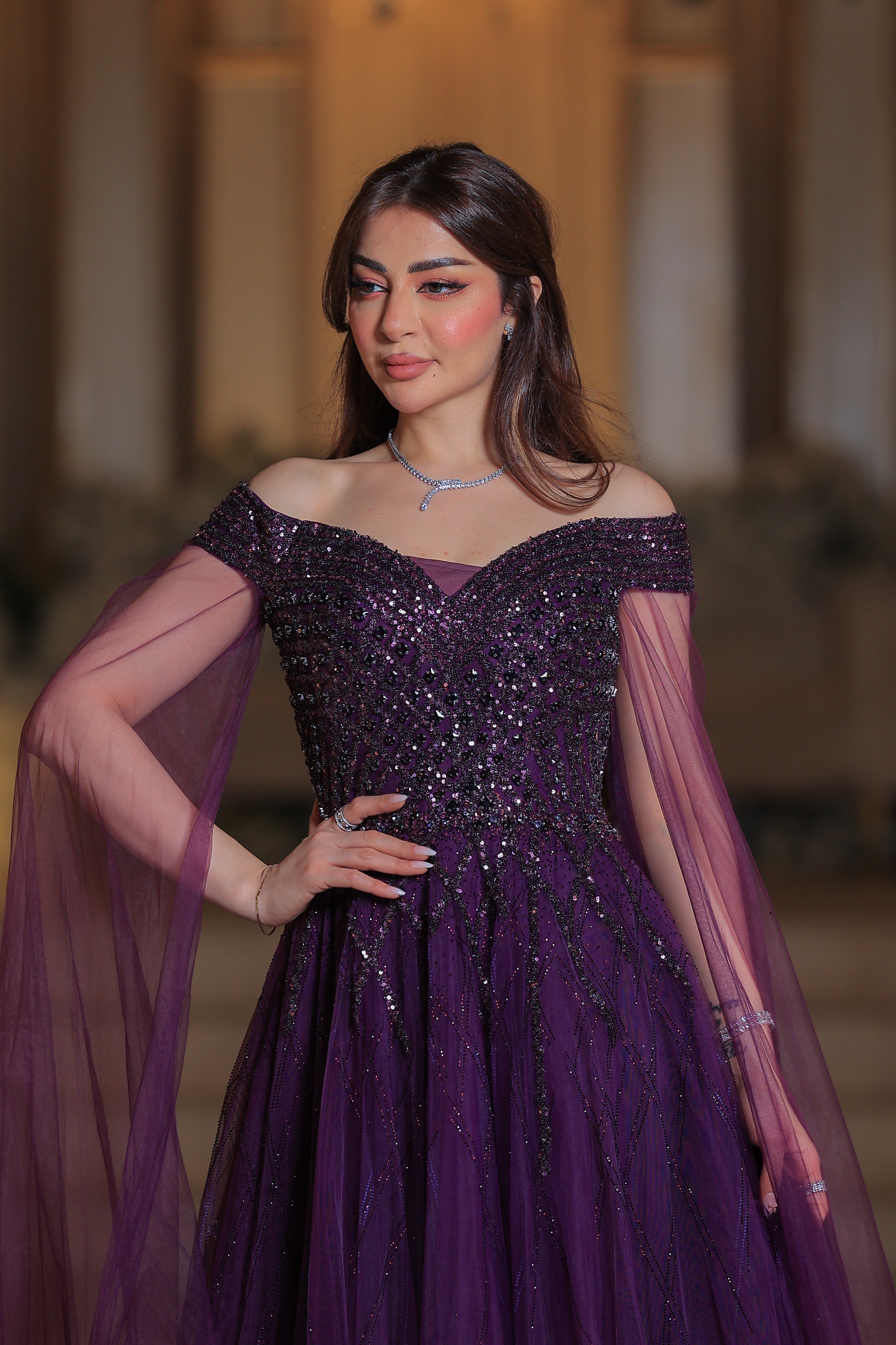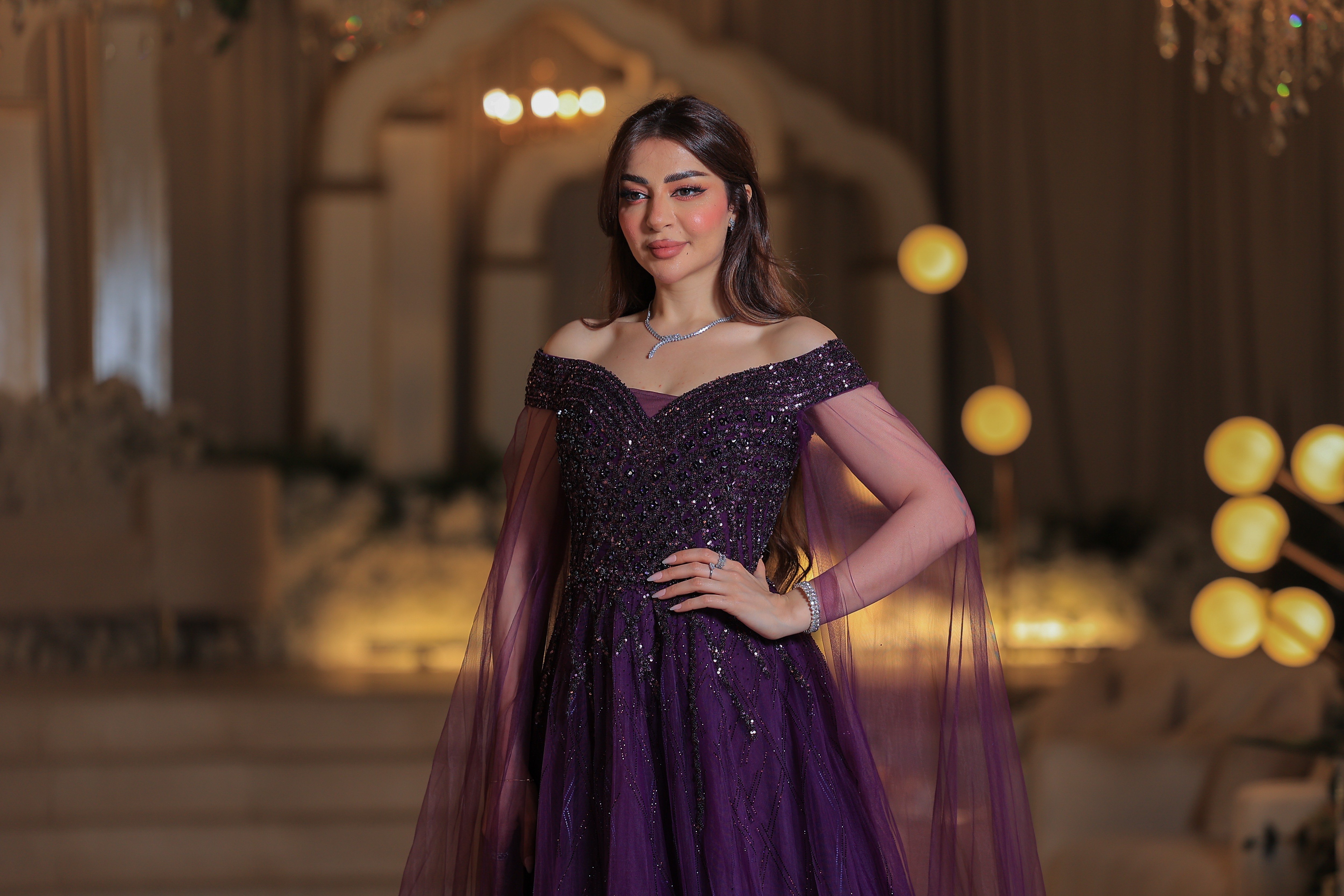 * الإكسسوارات: الفستان منسق مع عقد أنيق وأقراط متدلية، بالإضافة إلى أساور وخواتم، كلها تتناسق مع بريق الفستان.