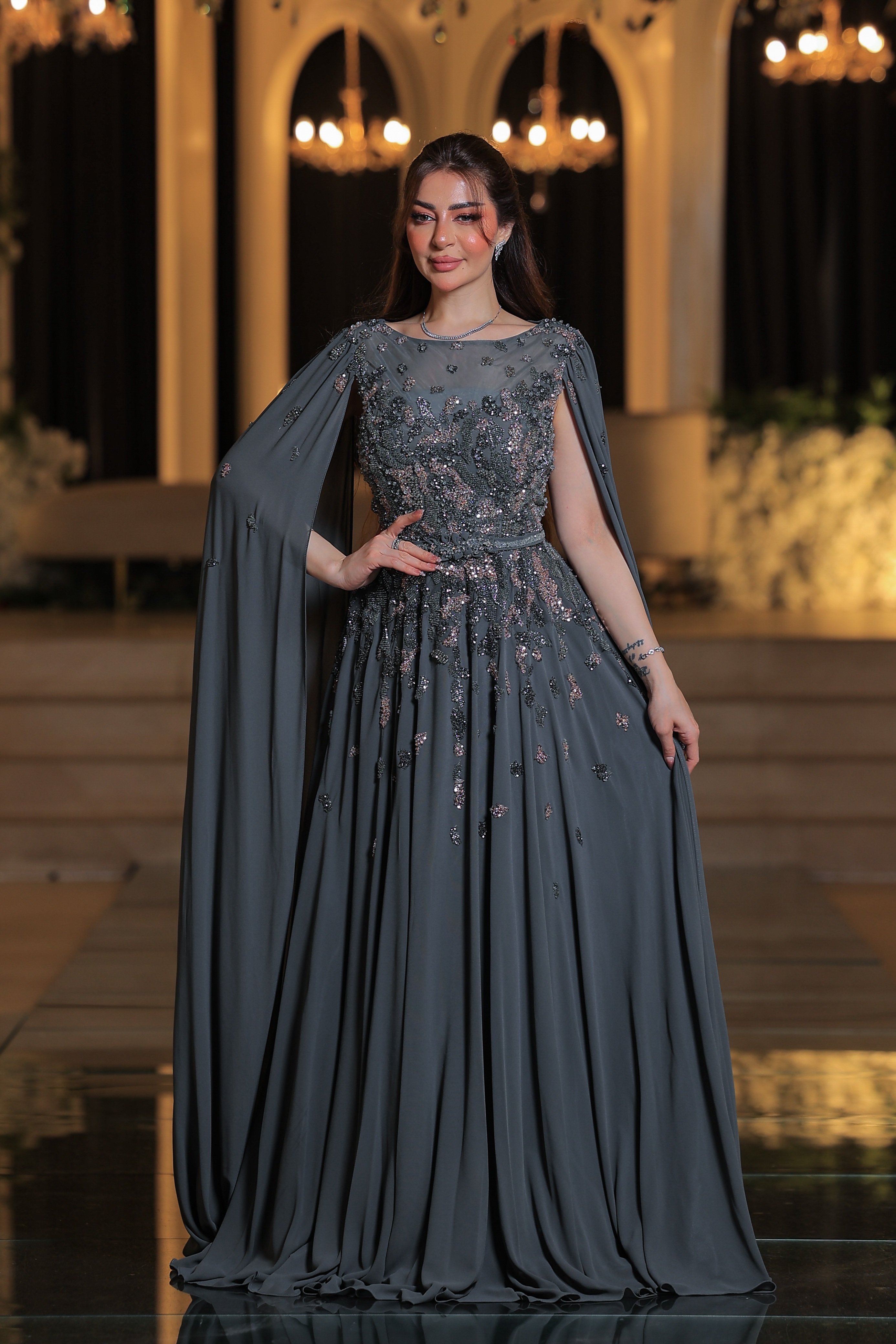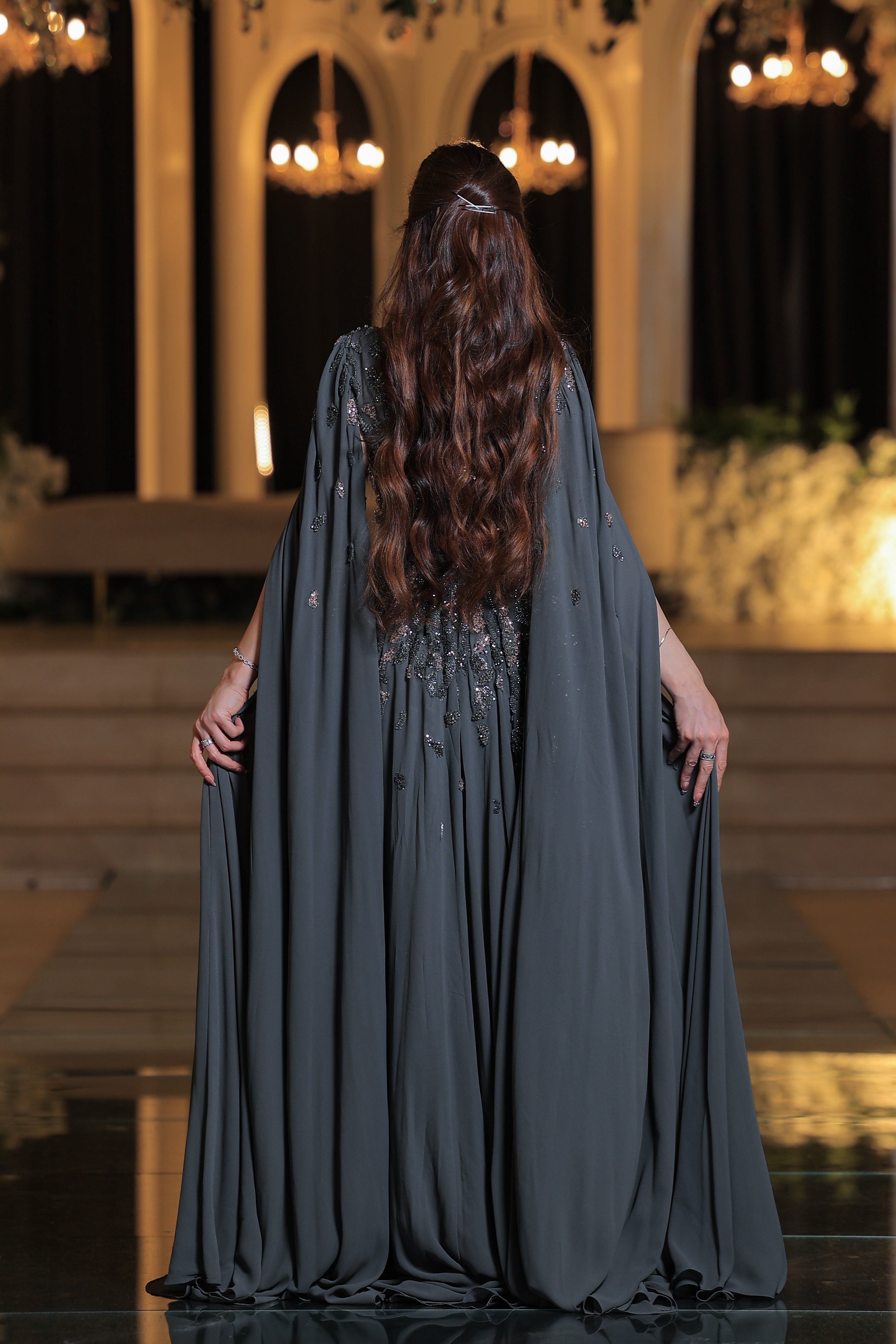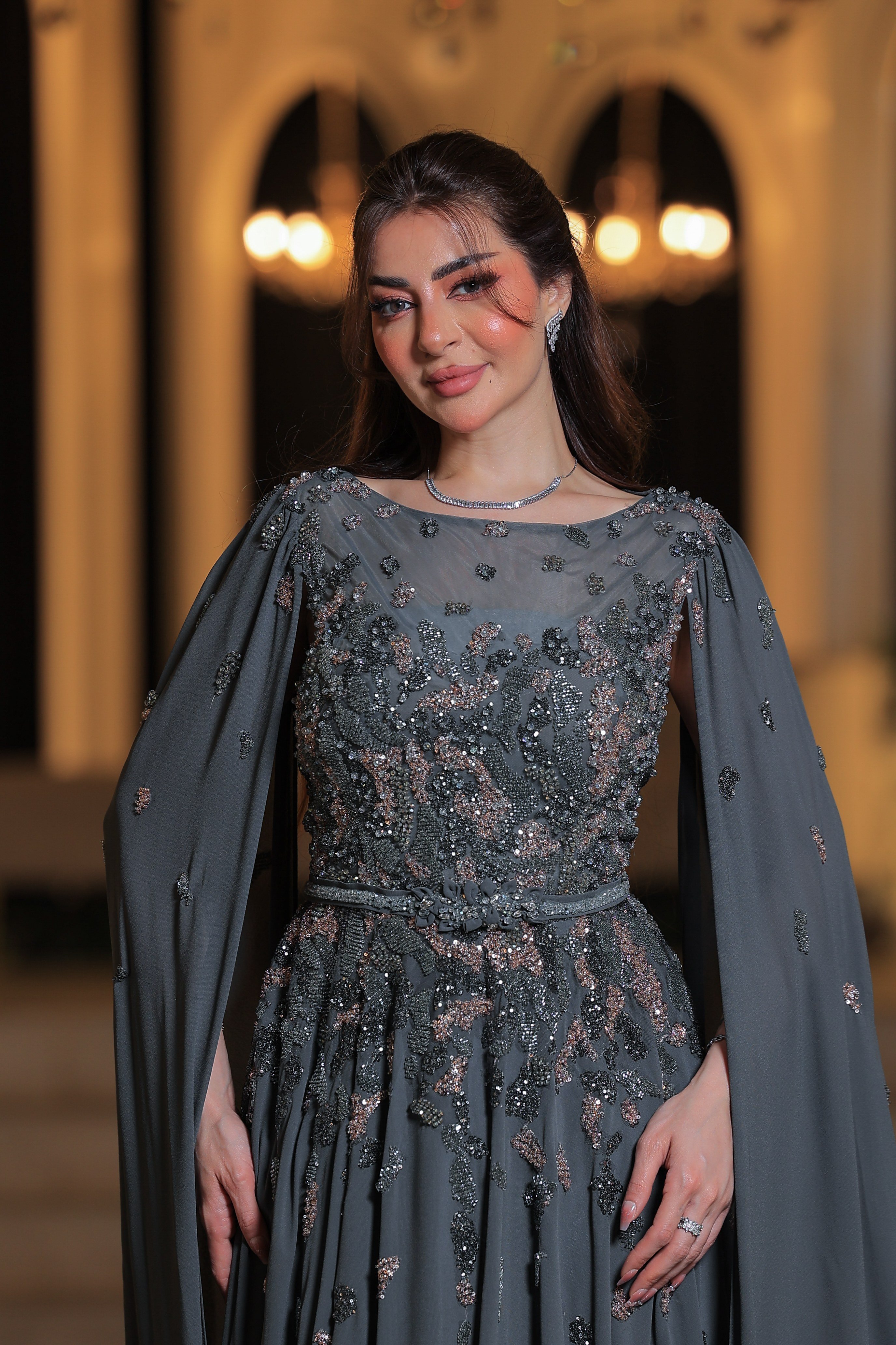 الأكمام: على شكل كاب طويل (cape style) منسدل من الكتف، مما يمنح الفستان طابعًا ملكيًا وكأنه يليق بالأميرات.