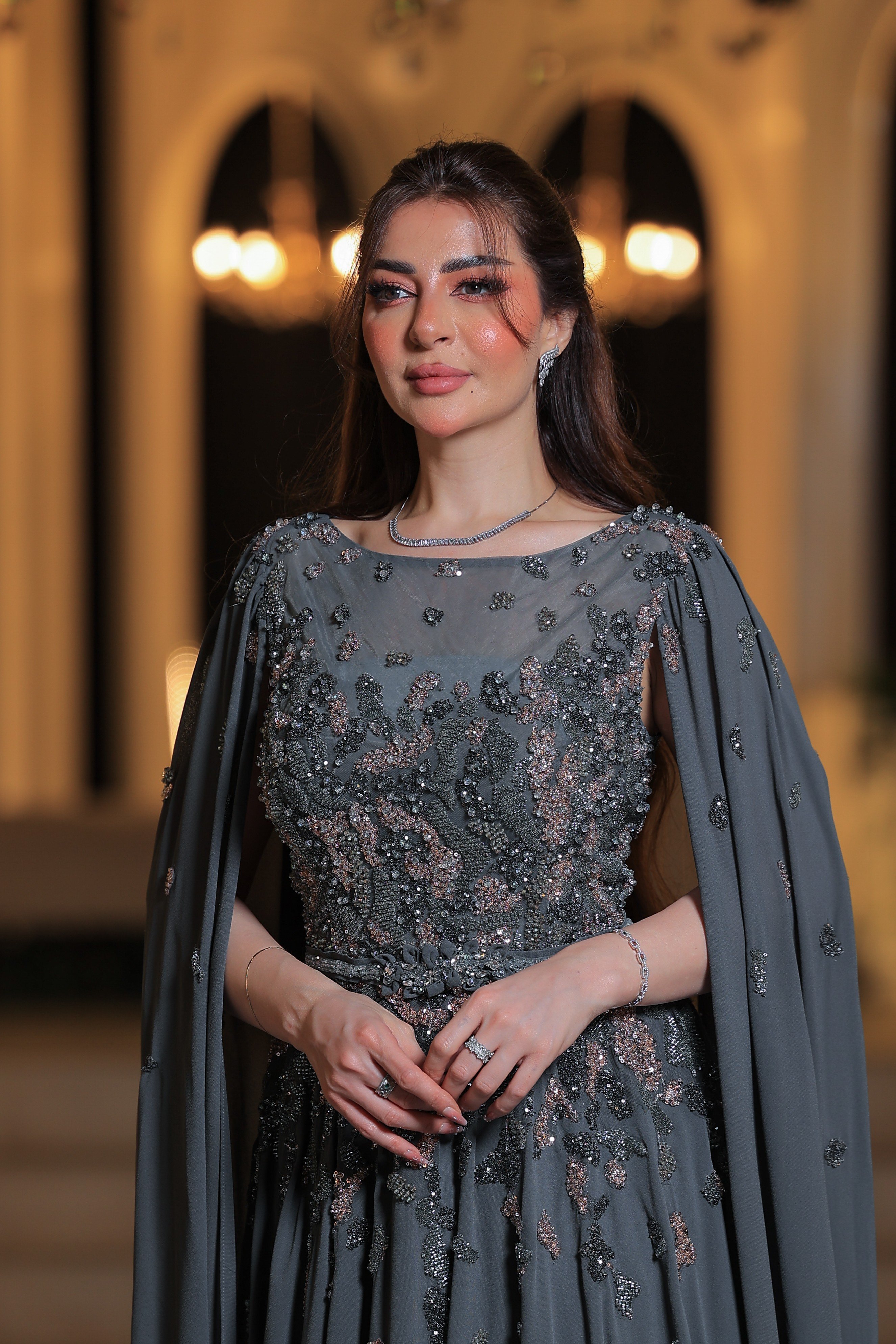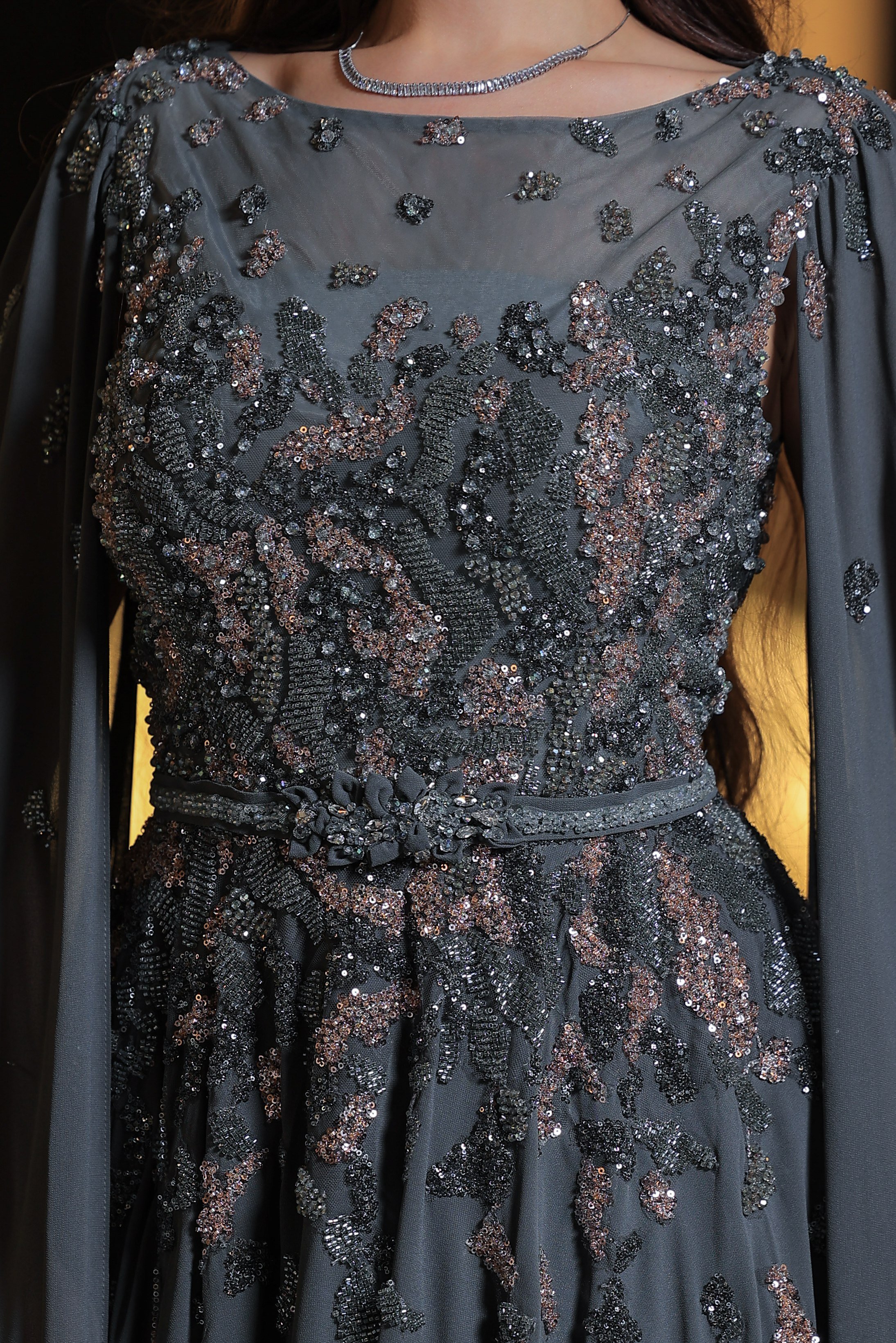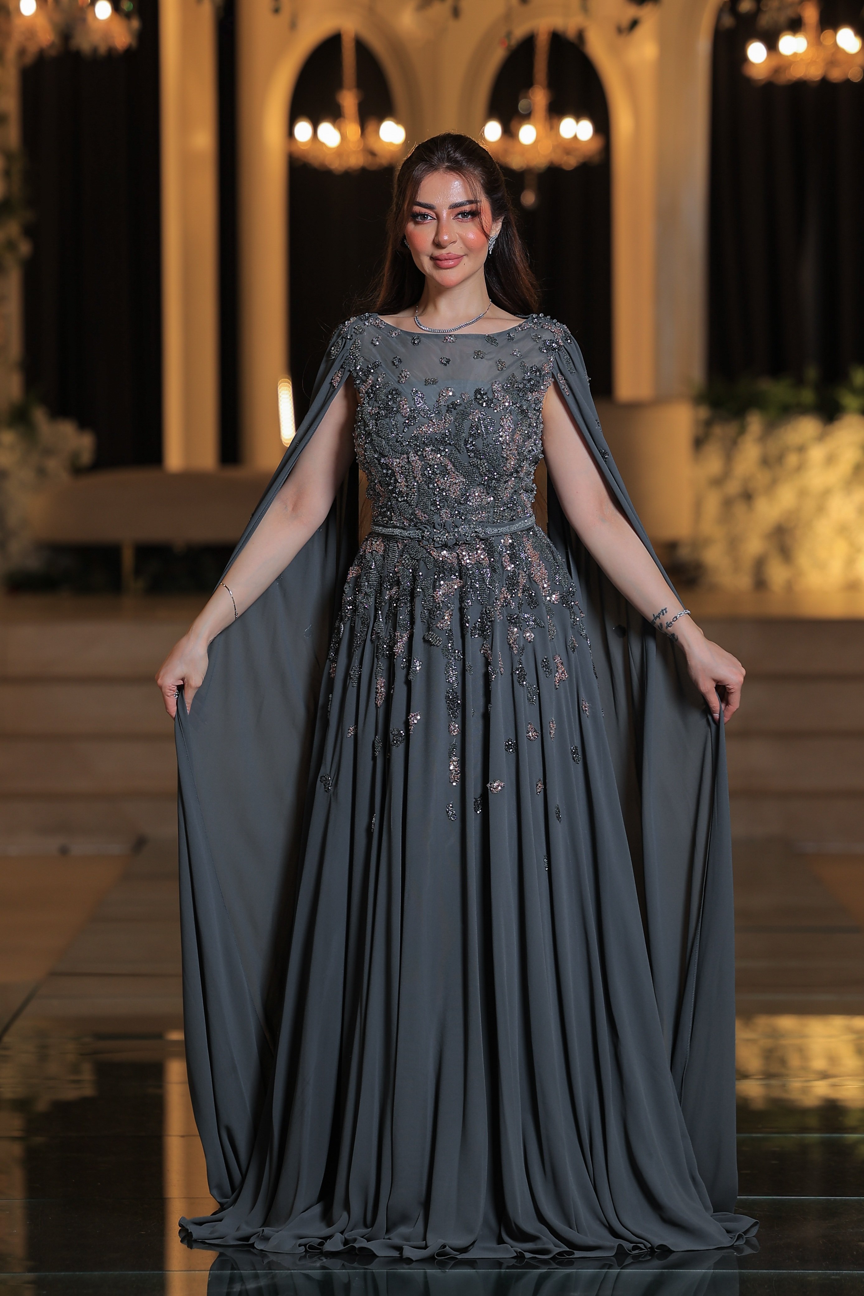 الأكمام: على شكل كاب طويل (cape style) منسدل من الكتف، مما يمنح الفستان طابعًا ملكيًا وكأنه يليق بالأميرات.