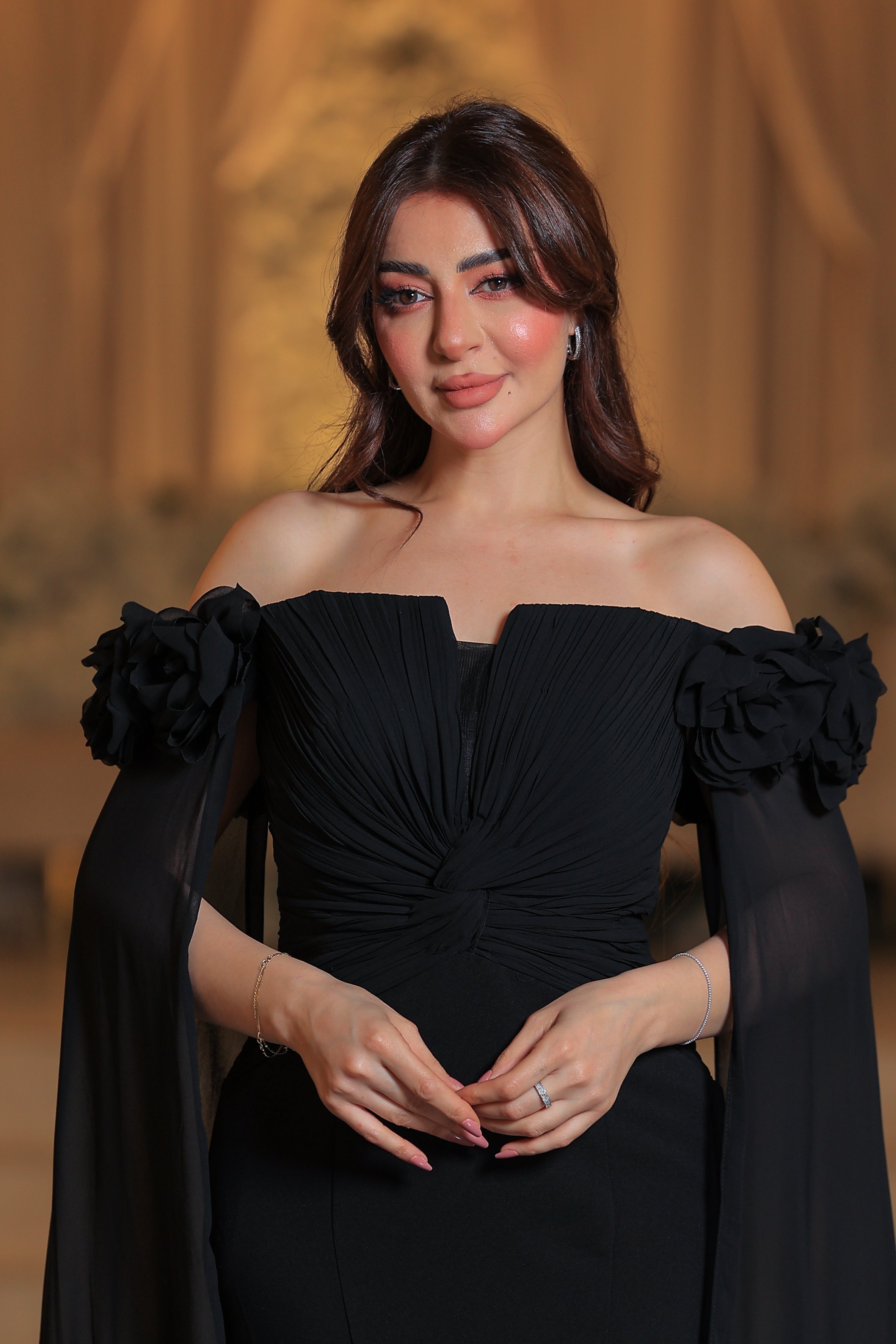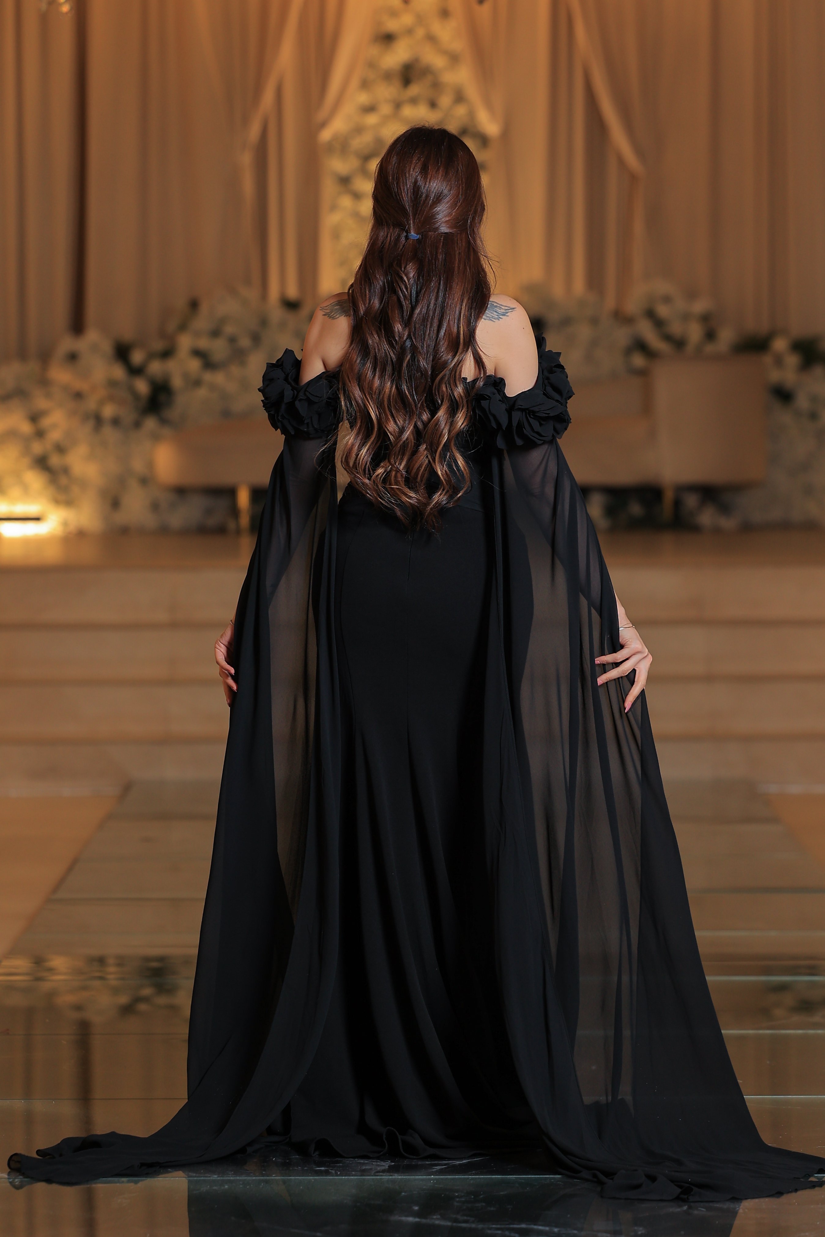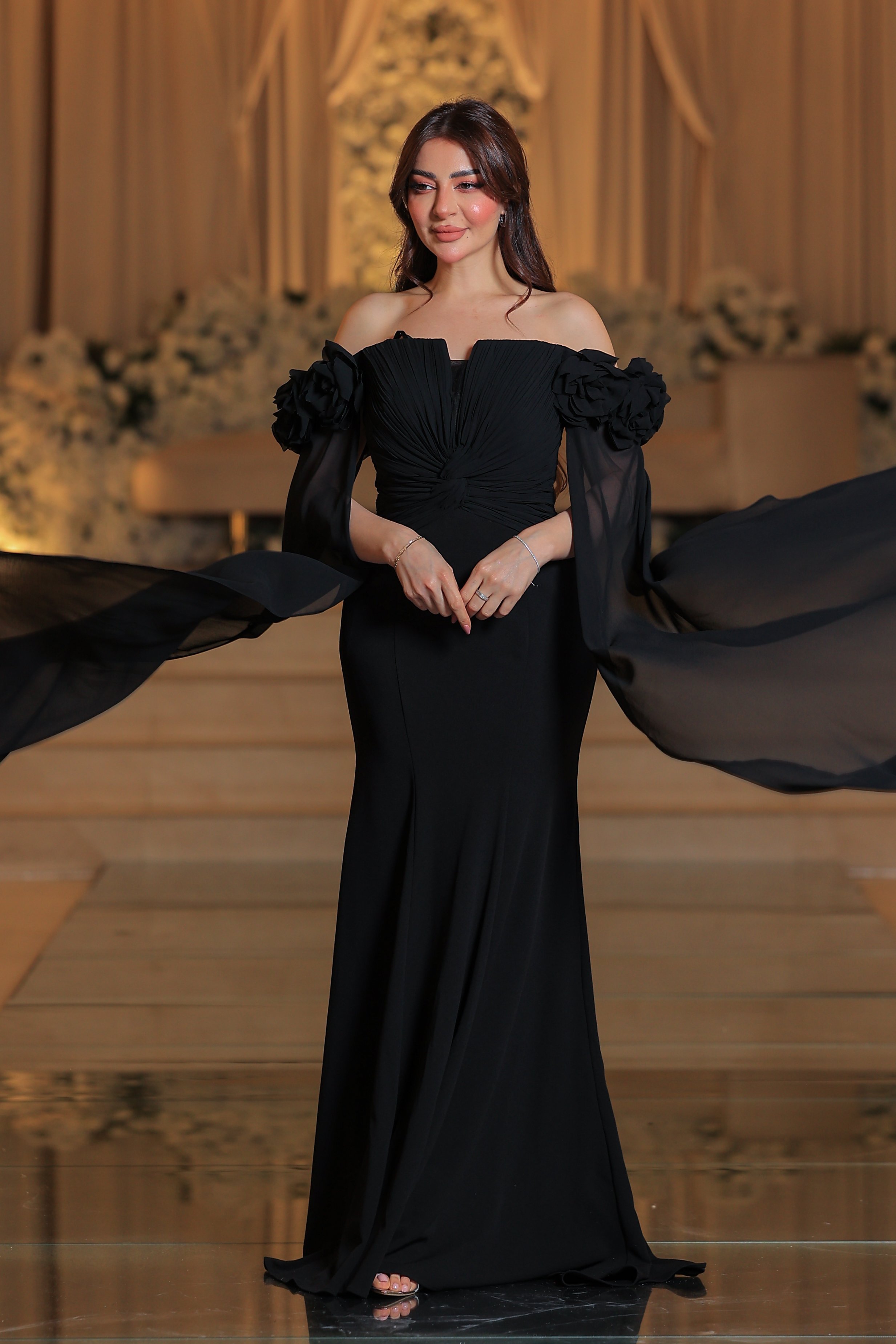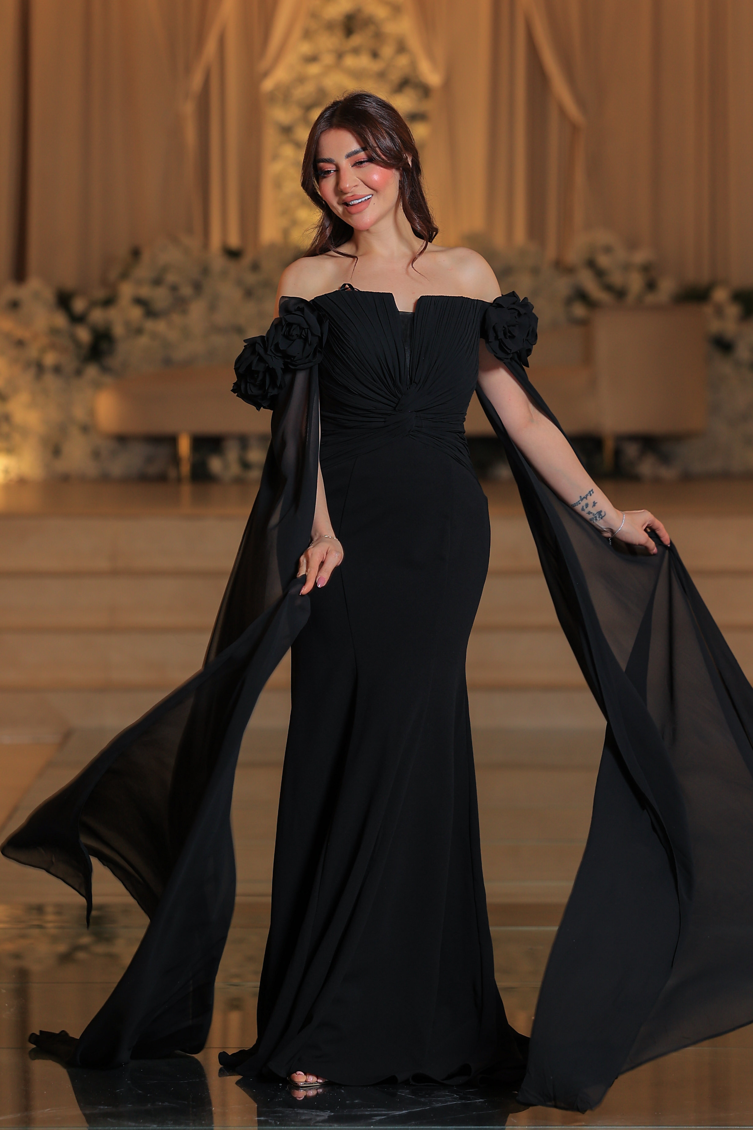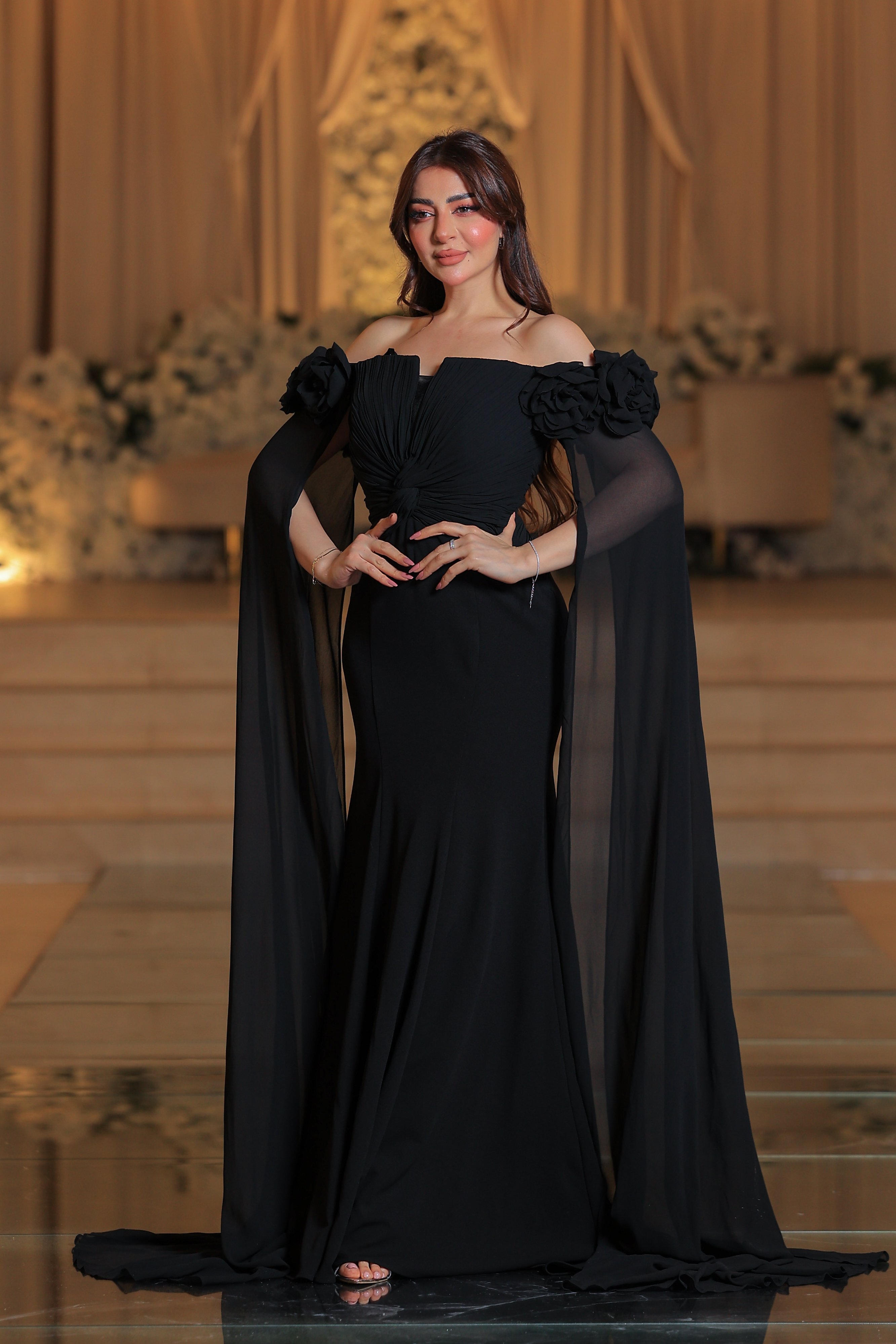 فستان عبارة عن ثوب سهرة طويل بلون اسود ملكي. يتميز بتصميم مكشوف الكتفين (off-shoulder) مع أكمام طويلة منسدلة بشكل كاب (cape sleeves) تتصل بالكتفين وتنسدل حتى الأرض. الكتفين مزينان بزخارف ثلاثية الأبعاد تشبه الورود أو الكشكشة الكبيرة. منطقة الصدر مصممة بقصة أنيقة على شكل حرف V مع تفاصيل مجمعة أو ملتفة في المنتصف (ruched or twisted detail) مما يبرز الخصر. الجزء السفلي من الفستان ينسدل بقصة مستقيمة أو حورية البحر قليلاً، مع اتساع طفيف نحو الأسفل. القماش يبدو ناعمًا وله ثنية جميلة.