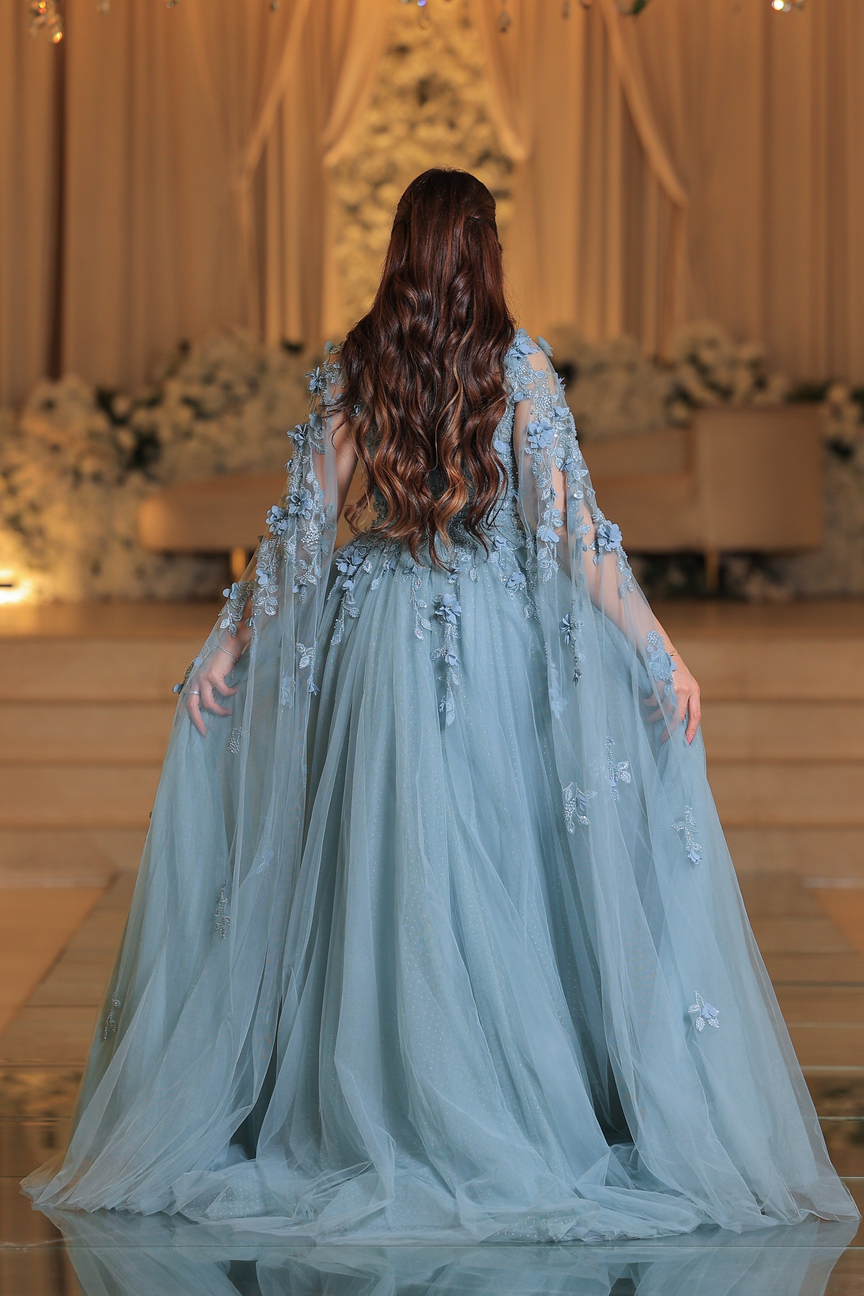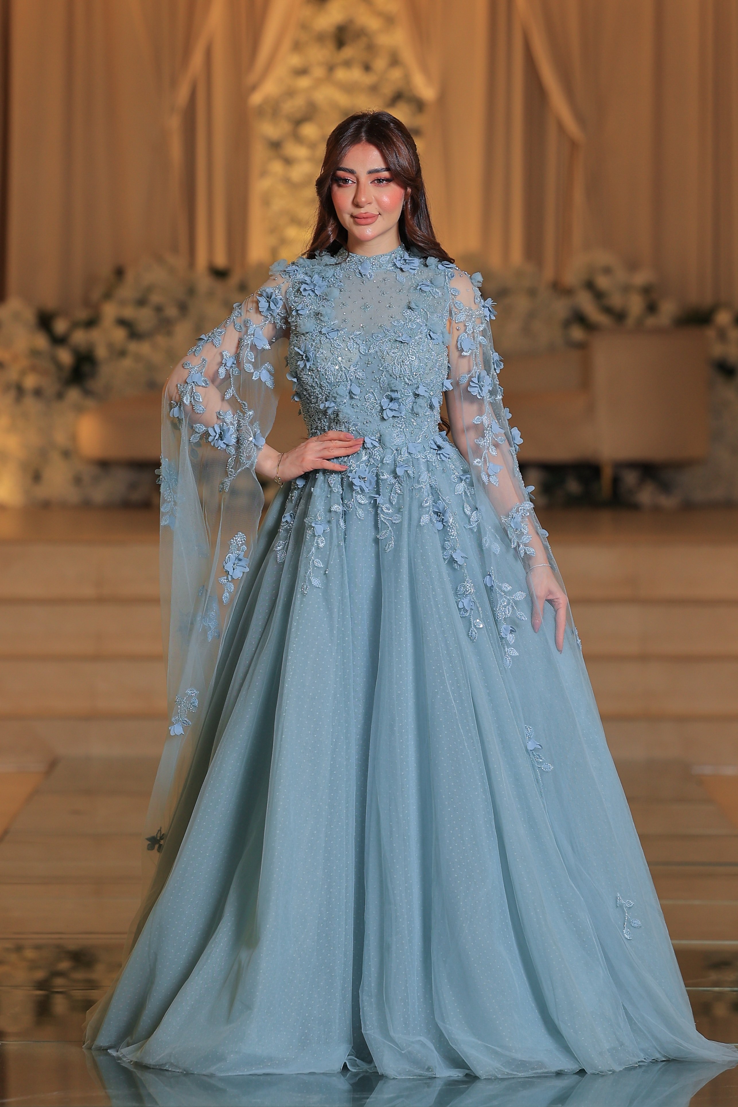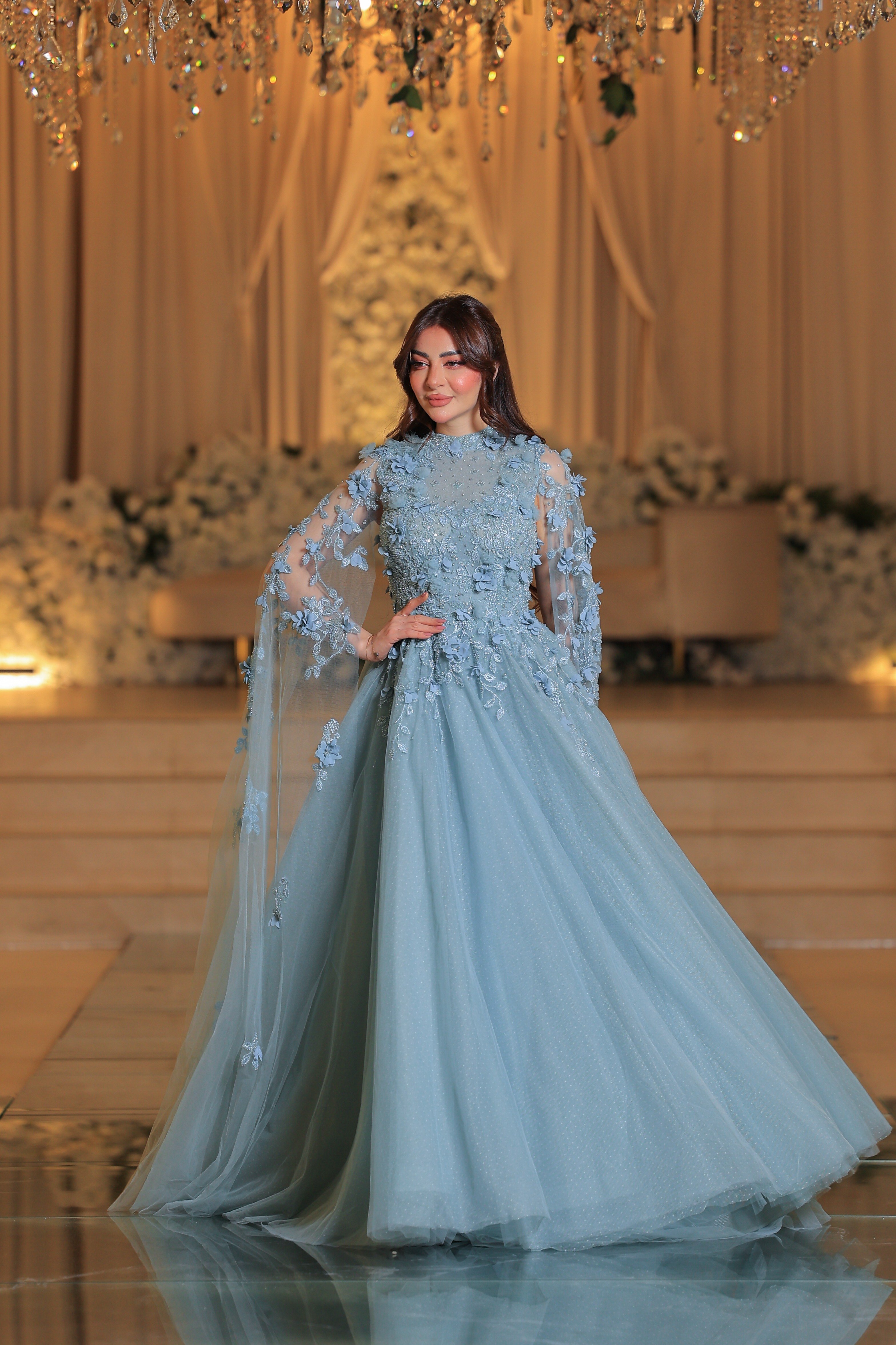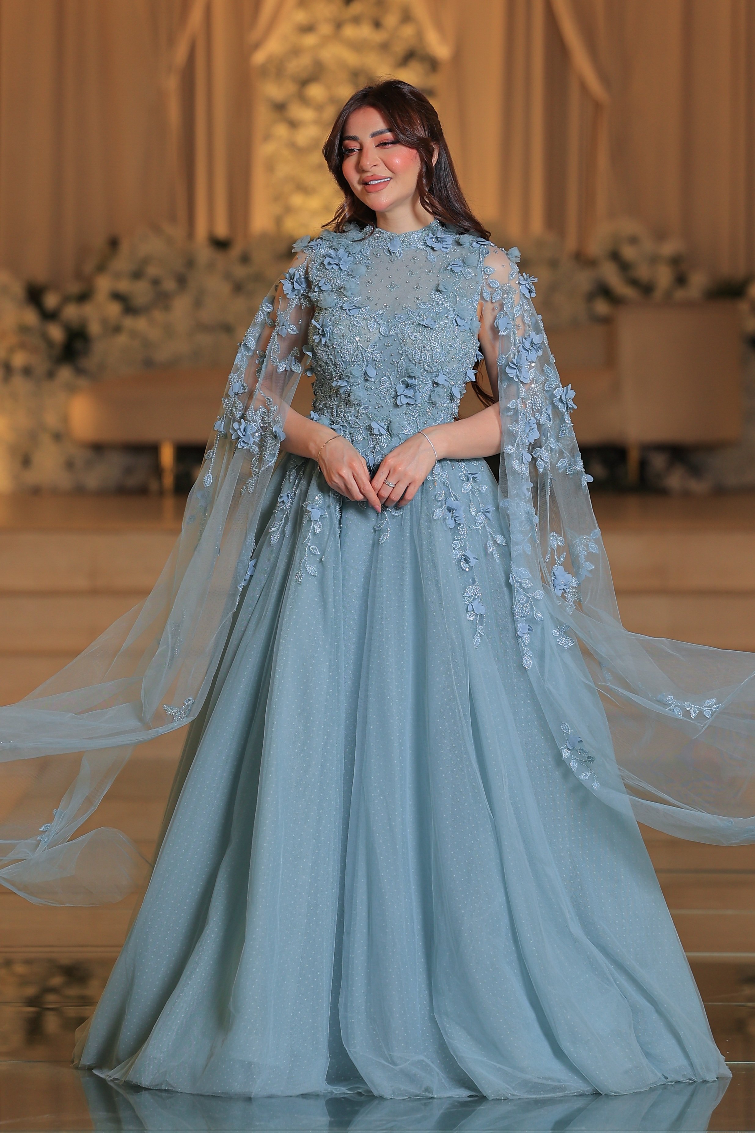 اللون الأزرق الهادئ يعكس إحساسًا بالرقي والهدوء، ويُعدّ اختيارًا مثاليًا للخطوبة أو المناسبات الراقية.